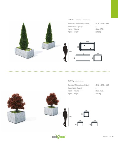 MODULAR 85Boyutlar / Dimensions (LxWxH)Kapasitesi / CapacityHacim / Volume A%u011f%u0131rl%u0131k / weightBoyutlar / Dimensions (LxWxH)Kapasitesi / CapacityHacim / Volume A%u011f%u0131rl%u0131k / weightCUS 353 uzun saks%u0131 / long planterCUS 354 saks%u0131 / planter: 1,16 x 0,58 x 0,45: -: Max. 175L: 316 kg: 0,58 x 0,58 x 0,45: -: Max. 150L: 170 kg175175585858116116454558 58 584545
