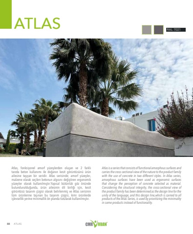 88 ATLASAtlas, fonksiyonel amorf y%u00fczeylerden olu%u015fan ve 2 farkl%u0131 tarzda beton kullan%u0131m%u0131 ile do%u011fan%u0131n kesit g%u00f6r%u00fcnt%u00fcs%u00fcn%u00fc %u00fcr%u00fcn ailesine ta%u015f%u0131yan bir seridir. Atlas serisinde; amorf y%u00fczeyler, malzene olarak se%u00e7ilen betonun alg%u0131s%u0131n%u0131 de%u011fi%u015ftiren ergonomik y%u00fczeyler olarak kullan%u0131lm%u0131%u015ft%u0131r.Yap%u0131sal b%u00fct%u00fcnl%u00fck g%u00f6z %u00f6n%u00fcnde bulunduruldu%u011funda, %u00fcr%u00fcn ailesinin dil birli%u011fi i%u00e7in, kesit g%u00f6r%u00fcnt%u00fcs%u00fc tasar%u0131m %u00e7izgisi olarak belirlenmi%u015f ve Atlas serisinin t%u00fcm %u00fcr%u00fcnlerine ta%u015f%u0131nan bu tasar%u0131m %u00e7izgisi, kimi %u00fcr%u00fcnlerde i%u015flevsellik yerine minimallik %u00f6n planda tutularak kullan%u0131lm%u0131%u015ft%u0131r.Atlas is a series that consists of functional amorphous surfaces and carries the cross-sectional view of the nature to the product family with the use of concrete in two different styles. In Atlas series, amorphous surfaces have been used as ergonomic surfaces that change the perception of concrete selected as material. Considering the structural integrity, the cross-sectional view of the product family has been determined as the design line for the unity of the language, and this design line,which is carried to all products of the Atlas Series, is used by prioritizing the minimality in some products instead of functionality.ATLAS RAL 7021