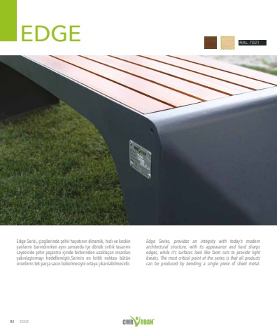 92 EDGEEdge Serisi, %u00e7izgilerinde %u015fehir hayat%u0131n%u0131n dinamik, h%u0131zl%u0131 ve keskin yanlar%u0131n%u0131 bar%u0131nd%u0131r%u0131rken ayn%u0131 zamanda i%u00e7e d%u00f6n%u00fck s%u0131rtl%u0131k tasar%u0131m%u0131 sayesinde %u015fehir ya%u015fant%u0131s%u0131 i%u00e7inde birbirinden uzakla%u015fan insanlar%u0131 yak%u0131nla%u015ft%u0131rmay%u0131 hedeflemi%u015ftir.Serinin en kritik noktas%u0131 b%u00fct%u00fcn %u00fcr%u00fcnlerin tek par%u00e7a sac%u0131n b%u00fck%u00fclmesiyle ortaya %u00e7%u0131kar%u0131labilmesidir.Edge Series, provides an integrity with today%u2019s modern architectural structure, with its appearance and hard sharps edges, while it%u2019s surfaces look like facet cuts to provide light breaks. The most critical point of the series is that all products can be produced by bending a single piece of sheet metal.EDGE RAL 7021