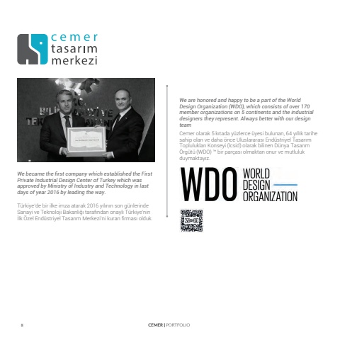 8 CEMER | PORTFOLIOWe became the first company which established the First Private Industrial Design Center of Turkey which was approved by Ministry of Industry and Technology in last days of year 2016 by leading the way.T%u00fcrkiye%u2019de bir ilke imza atarak 2016 y%u0131l%u0131n%u0131n son g%u00fcnlerinde Sanayi ve Teknoloji Bakanl%u0131%u011f%u0131 taraf%u0131ndan onayl%u0131 T%u00fcrkiye%u2019nin %u0130lk %u00d6zel End%u00fcstriyel Tasar%u0131m Merkezi%u2019ni kuran firmas%u0131 olduk.We are honored and happy to be a part of the World Design Organization (WDO), which consists of over 170 member organizations on 5 continents and the industrial designers they represent. Always better with our design teamCemer olarak 5 k%u0131tada y%u00fczlerce %u00fcyesi bulunan, 64 y%u0131ll%u0131k tarihe sahip olan ve daha %u00f6nce Uluslararas%u0131 End%u00fcstriyel Tasar%u0131m Topluluklar%u0131 Konseyi (lcsid) olarak bilinen D%u00fcnya Tasar%u0131m %u00d6rg%u00fct%u00fc (WDO) %u2122 bir par%u00e7as%u0131 olmaktan onur ve mutluluk duymaktay%u0131z.