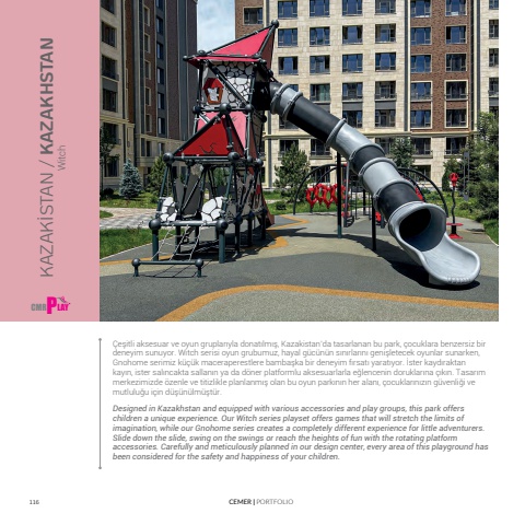 116 CEMER | PORTFOLIO%u00c7e%u015fitli aksesuar ve oyun gruplar%u0131yla donat%u0131lm%u0131%u015f, Kazakistan%u2019da tasarlanan bu park, %u00e7ocuklara benzersiz bir deneyim sunuyor. Witch serisi oyun grubumuz, hayal g%u00fcc%u00fcn%u00fcn s%u0131n%u0131rlar%u0131n%u0131 geni%u015fletecek oyunlar sunarken, Gnohome serimiz k%u00fc%u00e7%u00fck maceraperestlere bamba%u015fka bir deneyim f%u0131rsat%u0131 yarat%u0131yor. %u0130ster kayd%u0131raktan kay%u0131n, ister sal%u0131ncakta sallan%u0131n ya da d%u00f6ner platformlu aksesuarlarla e%u011flencenin doruklar%u0131na %u00e7%u0131k%u0131n. Tasar%u0131m merkezimizde %u00f6zenle ve titizlikle planlanm%u0131%u015f olan bu oyun park%u0131n%u0131n her alan%u0131, %u00e7ocuklar%u0131n%u0131z%u0131n g%u00fcvenli%u011fi ve mutlulu%u011fu i%u00e7in d%u00fc%u015f%u00fcn%u00fclm%u00fc%u015ft%u00fcr.KAZAK%u0130STAN / KAZAKHSTANDesigned in Kazakhstan and equipped with various accessories and play groups, this park offers children a unique experience. Our Witch series playset offers games that will stretch the limits of imagination, while our Gnohome series creates a completely different experience for little adventurers. Slide down the slide, swing on the swings or reach the heights of fun with the rotating platform accessories. Carefully and meticulously planned in our design center, every area of this playground has been considered for the safety and happiness of your children.CMR P LAYWitch