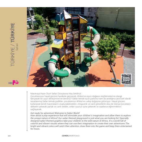122 CEMER | PORTFOLIOMaceraya Haz%u0131r Olun! Safari D%u00fcnyas%u0131na Ho%u015f Geldiniz!%u00c7ocuklar%u0131n%u0131z%u0131n hayal g%u00fcc%u00fcn%u00fc harekete ge%u00e7irecek, Afrika%u2019n%u0131n e%u015fsiz do%u011fas%u0131n%u0131 ke%u015ffetmelerine olanak tan%u0131yacak bir oyun deneyimine ne dersiniz? Safari temal%u0131 oyun park%u0131m%u0131z tam da arad%u0131%u011f%u0131n%u0131z %u015fey!%u00d6zel olarak tasarlanm%u0131%u015f Safari temal%u0131 grafikler, %u00e7ocuklar%u0131n%u0131z%u0131 Afrika%u2019n%u0131n vah%u015fi do%u011fas%u0131na g%u00f6t%u00fcr%u00fcyor. Hayal g%u00fcc%u00fcn%u00fc kullanarak kendi maceralar%u0131n%u0131 olu%u015fturabilecekleri, rengarenk ve canl%u0131 g%u00f6rsellerle dolu bir d%u00fcnya.%u00c7ocuklar%u0131n dikkatini %u00e7ekecek parlak ve canl%u0131 renkler, onlar%u0131 oyunun i%u00e7ine %u00e7ekecek ve saatlerce e%u011flenmelerini sa%u011flayacak.T%u00dcRK%u0130YE / T%u00dcRK%u0130YEGet ready for adventure! Welcome to Safari World!How about a play experience that will stimulate your children%u2019s imagination and allow them to explore the unique nature of Africa? Our safari themed playground is just what you are looking for! Specially designed safari themed graphics take your children to the wild nature of Africa. It%u2019s a world full of colorful and vibrant visuals where they can use their imagination to create their own adventures.The bright and vibrant colors will catch their attention, draw them into the game and keep them entertained for hours.CMR P LAYSafari