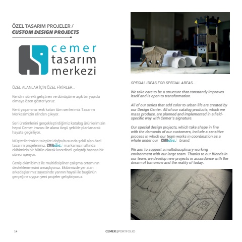 14 CEMER | PORTFOLIO%u00d6ZEL ALANLAR %u0130%u00c7%u0130N %u00d6ZEL F%u0130K%u0130RLER...Kendini s%u00fcrekli geli%u015ftiren ve d%u00f6n%u00fc%u015f%u00fcme a%u00e7%u0131k bir yap%u0131da olmaya %u00f6zen g%u00f6steriyoruz. Kent ya%u015fam%u0131na renk katan t%u00fcm serilerimiz Tasar%u0131m Merkezimizin elinden %u00e7%u0131k%u0131yor. Seri %u00fcretimlerini ger%u00e7ekle%u015ftirdi%u011fimiz katalog %u00fcr%u00fcnlerimizin hepsi Cemer imzas%u0131 ile alana %u00f6zg%u00fc %u015fekilde planlanarak hayata ge%u00e7iriliyor.M%u00fc%u015fterilerimizin talepleri do%u011frultusunda %u015fekil alan %u00f6zel tasar%u0131m projelerimiz, markam%u0131z%u0131n alt%u0131nda ekibimizin bir b%u00fct%u00fcn olarak koordineli %u00e7al%u0131%u015ft%u0131%u011f%u0131 hassas bir s%u00fcreci i%u00e7eriyor.Geni%u015f ekimibimiz ile multidisipliner %u00e7al%u0131%u015fma ortam%u0131n%u0131n desteklenmesini ama%u00e7l%u0131yoruz. Ekibimizde yer alan arkada%u015flar%u0131m%u0131z sayesinde yar%u0131n%u0131n hayali ile bug%u00fcn%u00fcn ger%u00e7e%u011fine uygun yeni projeler geli%u015ftiriyoruz.SPECIAL IDEAS FOR SPECIAL AREAS...We take care to be a structure that constantly improves itself and is open to transformation. All of our series that add color to urban life are created by our Design Center. All of our catalog products, which we mass produce, are planned and implemented in a fieldspecific way with Cemer%u2019s signature.Our special design projects, which take shape in line with the demands of our customers, include a sensitive process in which our team works in coordination as a whole under our brand.We aim to support a multidisciplinary working environment with our large team. Thanks to our friends in our team, we develop new projects in accordance with the dream of tomorrow and the reality of today.%u00d6ZEL TASARIM PROJELER /CUSTOM DESIGN PROJECTS
