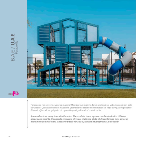 18 CEMER | PORTFOLIOParadox ile her seferinde yeni bir macera! Mod%u00fcler kule sistemi, farkl%u0131 %u015fekillerde ve y%u00fcksekliklerde %u00fcst %u00fcste konulabilir. %u00c7ocuklar%u0131n fiziksel m%u00fccadele yeteneklerini desteklerken heyecan ve ke%u015fif duygular%u0131n%u0131 peki%u015ftirir. G%u00fcvenli, e%u011flenceli ve geli%u015ftirici bir oyun d%u00fcnyas%u0131 i%u00e7in Paradox%u2019u tercih edin!A new adventure every time with Paradox! The modular tower system can be stacked in different shapes and heights. It supports children%u2019s physical challenge skills while reinforcing their sense of excitement and discovery. Choose Paradox for a safe, fun and developmental play world!B.A.E / U.A.E ParadoxflyCMR P LAY