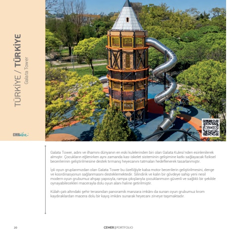 20 CEMER | PORTFOLIO T%u00dcRK%u0130YE / T%u00dcRK%u0130YE Galata TowerGalata Tower, ad%u0131n%u0131 ve ilham%u0131n%u0131 d%u00fcnyan%u0131n en eski kulelerinden biri olan Galata Kulesi%u2019nden esinlenilerek alm%u0131%u015ft%u0131r. %u00c7ocuklar%u0131n e%u011flenirken ayn%u0131 zamanda kas-iskelet sisteminin geli%u015fimine katk%u0131 sa%u011flayacak fiziksel becerilerinin geli%u015ftirilmesine destek t%u0131rman%u0131%u015f heyecan%u0131n%u0131 tatmalar%u0131 hedeflenerek tasarlanm%u0131%u015ft%u0131r. %u0130pli oyun gruplar%u0131m%u0131zdan olan Galata Tower bu %u00f6zelli%u011fiyle kaba motor becerilerin geli%u015ftirilmesini, denge ve koordinasyonun sa%u011flanmas%u0131n%u0131 desteklemektedir. Silindirik ve kal%u0131n bir g%u00f6vdeye sahip yeni nesil modern oyun grubumuz ah%u015fap yap%u0131s%u0131yla, rampa %u00e7%u0131k%u0131%u015flar%u0131yla %u00e7ocuklar%u0131m%u0131z%u0131n g%u00fcvenli ve sa%u011fl%u0131kl%u0131 bir %u015fekilde oynayabilecekleri macerayla dolu oyun alan%u0131 haline getirilmi%u015ftir. K%u00fclah %u00e7at%u0131 alt%u0131ndaki %u015fehir teras%u0131ndan panoramik manzara imk%u00e2n%u0131 da sunan oyun grubumuz krom kayd%u0131raklardan macera dolu bir kay%u0131%u015f imk%u00e2n%u0131 sunarak heyecan%u0131 zirveye ta%u015f%u0131maktad%u0131r.