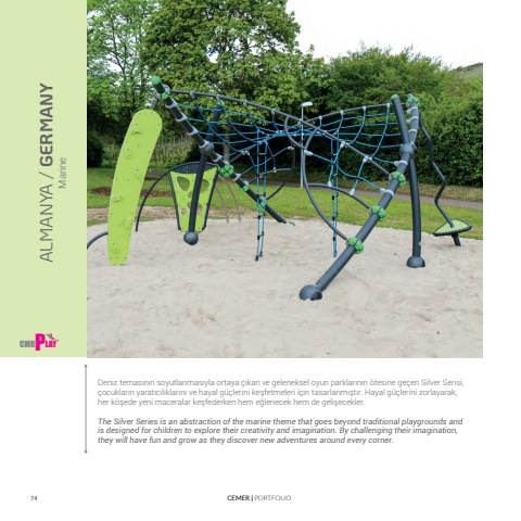 74 CEMER | PORTFOLIODeniz temas%u0131n%u0131n soyutlanmas%u0131yla ortaya %u00e7%u0131kan ve geleneksel oyun parklar%u0131n%u0131n %u00f6tesine ge%u00e7en Silver Serisi, %u00e7ocuklar%u0131n yarat%u0131c%u0131l%u0131klar%u0131n%u0131 ve hayal g%u00fc%u00e7lerini ke%u015ffetmeleri i%u00e7in tasarlanm%u0131%u015ft%u0131r. Hayal g%u00fc%u00e7lerini zorlayarak, her k%u00f6%u015fede yeni maceralar ke%u015ffederken hem e%u011flenecek hem de geli%u015fecekler.The Silver Series is an abstraction of the marine theme that goes beyond traditional playgrounds and is designed for children to explore their creativity and imagination. By challenging their imagination, they will have fun and grow as they discover new adventures around every corner.CMR P LAYMarine ALMANYA / GERMANY