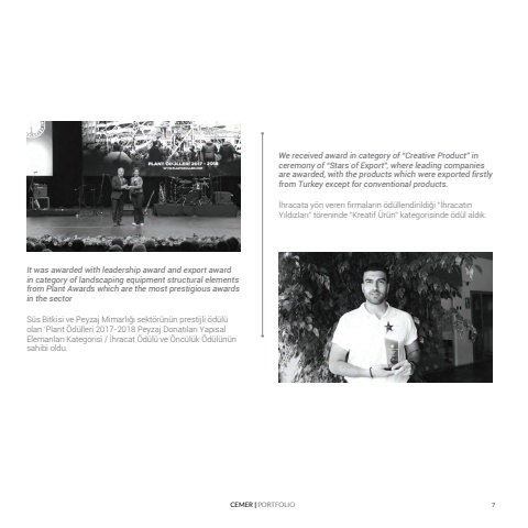CEMER | PORTFOLIO 7It was awarded with leadership award and export award in category of landscaping equipment structural elements from Plant Awards which are the most prestigious awards in the sectorS%u00fcs Bitkisi ve Peyzaj Mimarl%u0131%u011f%u0131 sekt%u00f6r%u00fcn%u00fcn prestijli %u00f6d%u00fcl%u00fc olan %u2018Plant %u00d6d%u00fclleri 2017-2018 Peyzaj Donat%u0131lar%u0131 Yap%u0131sal Elemanlar%u0131 Kategorisi / %u0130hracat %u00d6d%u00fcl%u00fc ve %u00d6nc%u00fcl%u00fck %u00d6d%u00fcl%u00fcn%u00fcn sahibi oldu.We received award in category of %u201cCreative Product%u201d in ceremony of %u201cStars of Export%u201d, where leading companies are awarded, with the products which were exported firstly from Turkey except for conventional products.%u0130hracata y%u00f6n veren firmalar%u0131n %u00f6d%u00fcllendirildi%u011fi %u201c%u0130hracat%u0131n Y%u0131ld%u0131zlar%u0131%u201d t%u00f6reninde %u201cKreatif %u00dcr%u00fcn%u201d kategorisinde %u00f6d%u00fcl ald%u0131k.