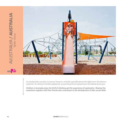 90 CEMER | PORTFOLIOAvustralya%u2019daki %u00e7ocuklar t%u0131rman%u0131%u015f%u0131n heyecan%u0131 ve ke%u015ffin getirdi%u011fi deneyimle e%u011flencenin doruklar%u0131na %u00e7%u0131k%u0131yorlar. Bu deneyimi birlikte payla%u015fmak, sosyal becerilerinin geli%u015fmesine de katk%u0131da bulunuyor.Children in Australia enjoy the thrill of climbing and the experience of exploration. Sharing this experience together with their friends also contributes to the development of their social skills.AVUSTRALYA / AUSTRALIACMR P LAYSpider Group
