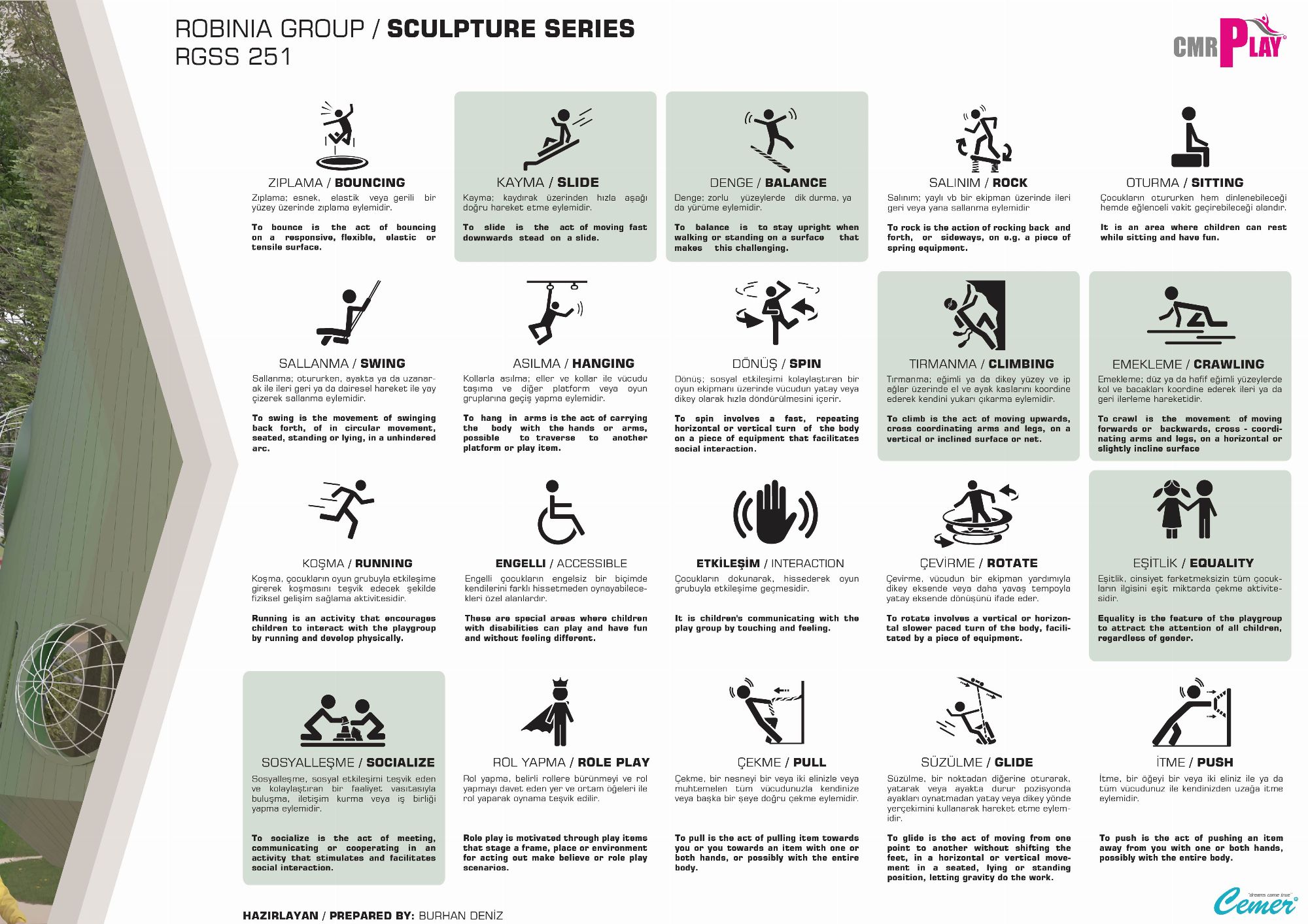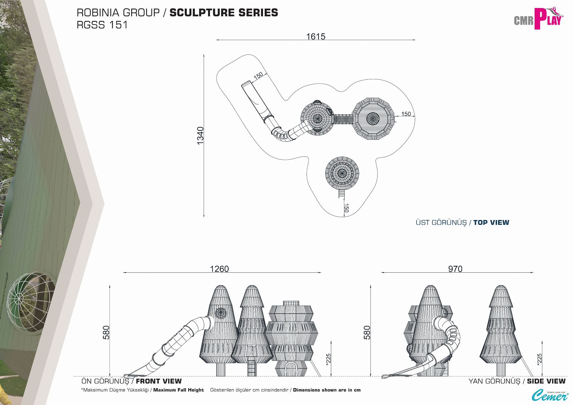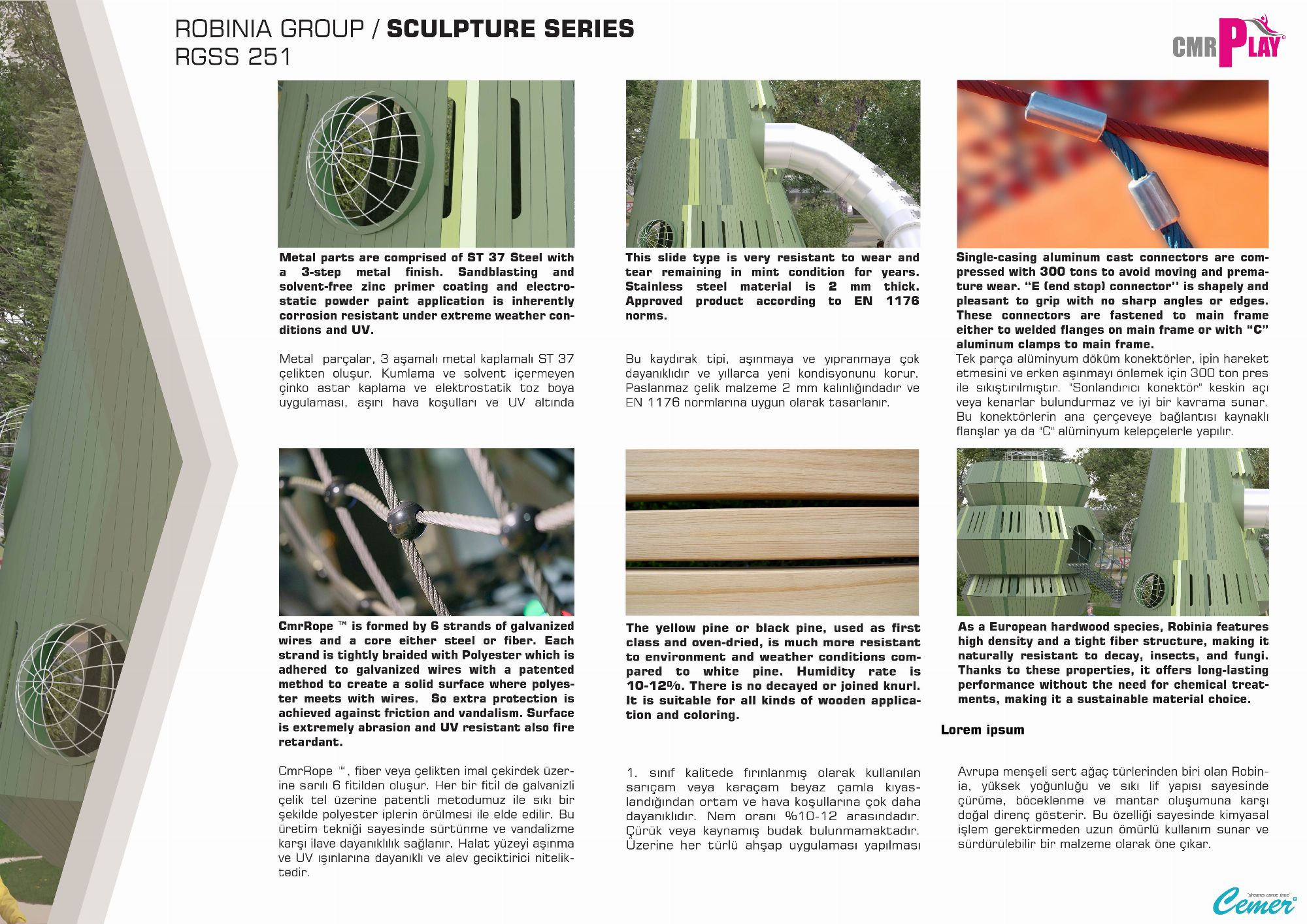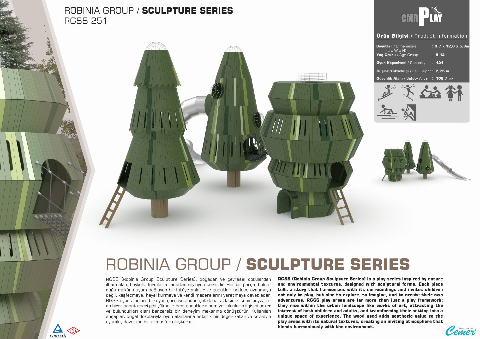 RGSS (Robinia Group Sculpture Series) is a play series inspired by nature and environmental textures, designed with sculptural forms. Each piece tells a story that harmonizes with its surroundings and invites children not only to play, but also to explore, to imagine, and to create their own adventures. RGSS play areas are far more than just a play framework; they rise within the urban landscape like works of art, attracting the interest of both children and adults, and transforming their setting into a unique space of experience. The wood used adds aesthetic value to the play areas with its natural textures, creating an inviting atmosphere that blends harmoniously with the environment.
