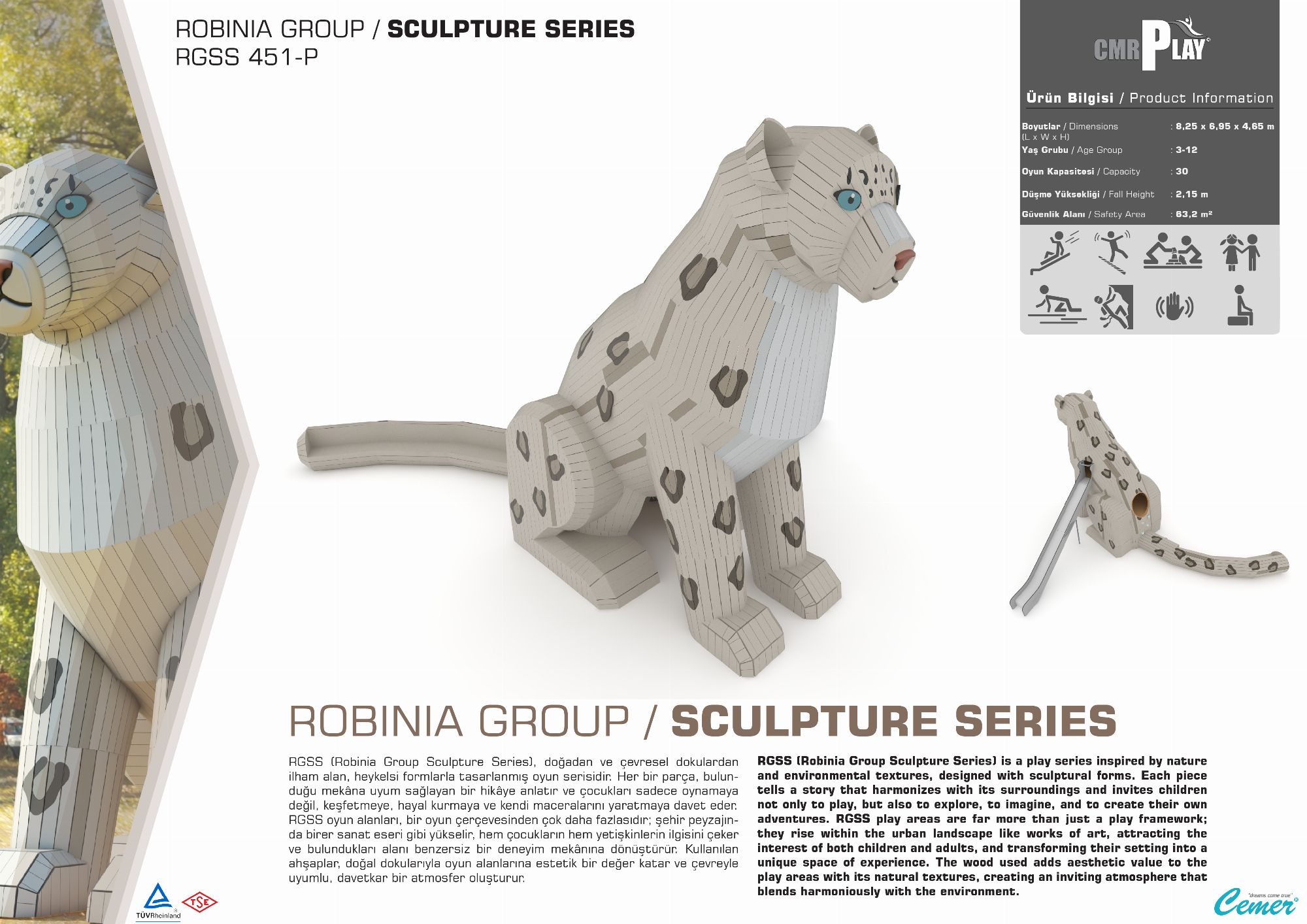 RGSS (Robinia Group Sculpture Series) is a play series inspired by nature and environmental textures, designed with sculptural forms. Each piece tells a story that harmonizes with its surroundings and invites children not only to play, but also to explore, to imagine, and to create their own adventures. RGSS play areas are far more than just a play framework; they rise within the urban landscape like works of art, attracting the interest of both children and adults, and transforming their setting into a unique space of experience. The wood used adds aesthetic value to the play areas with its natural textures, creating an inviting atmosphere that blends harmoniously with the environment.