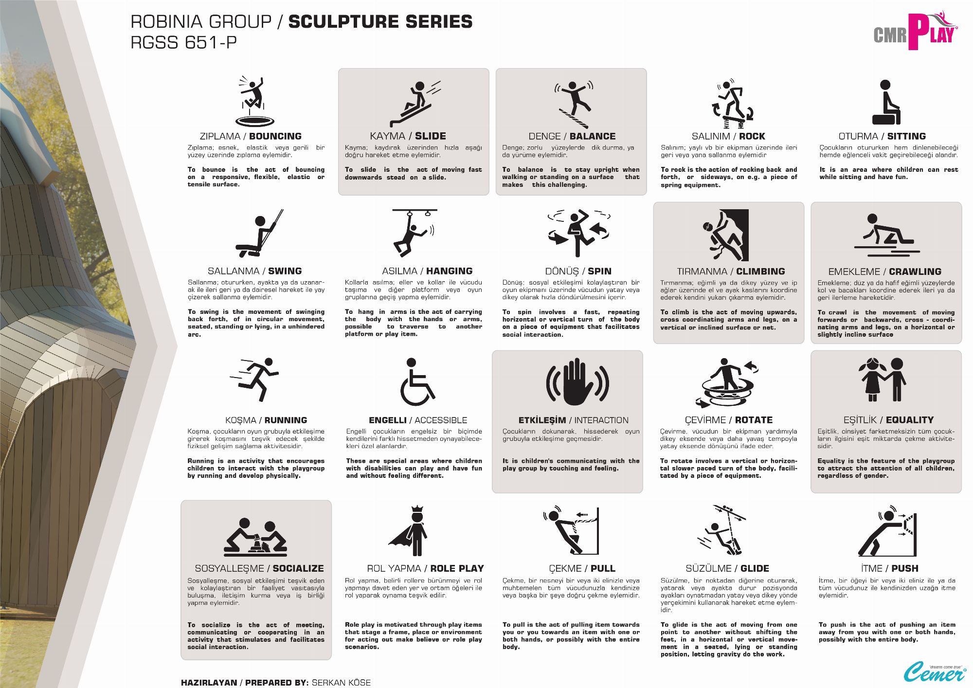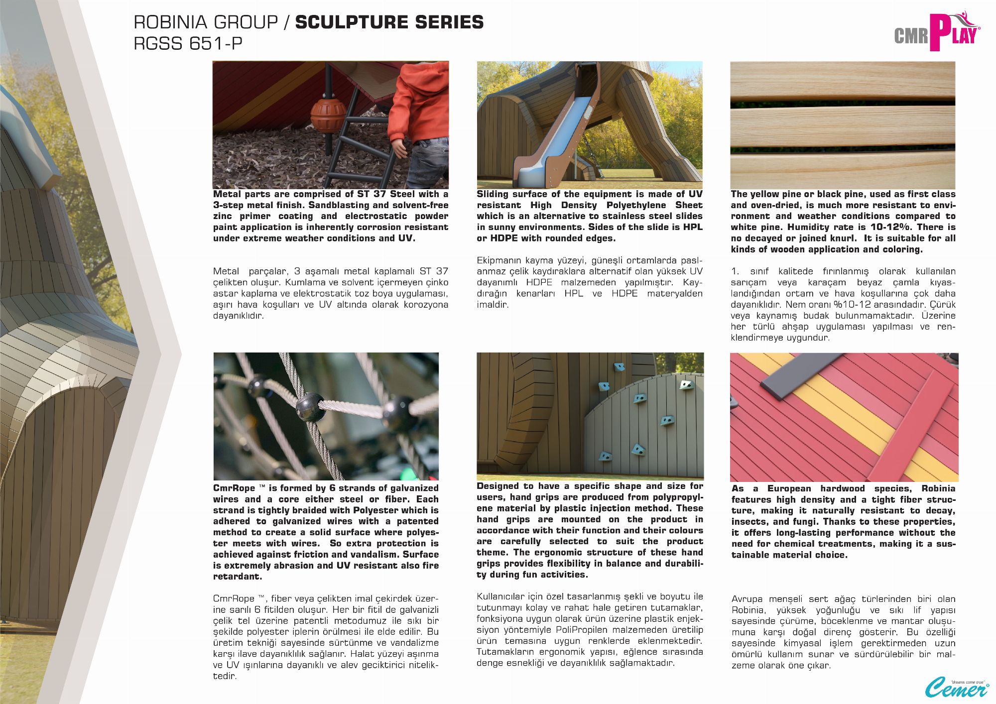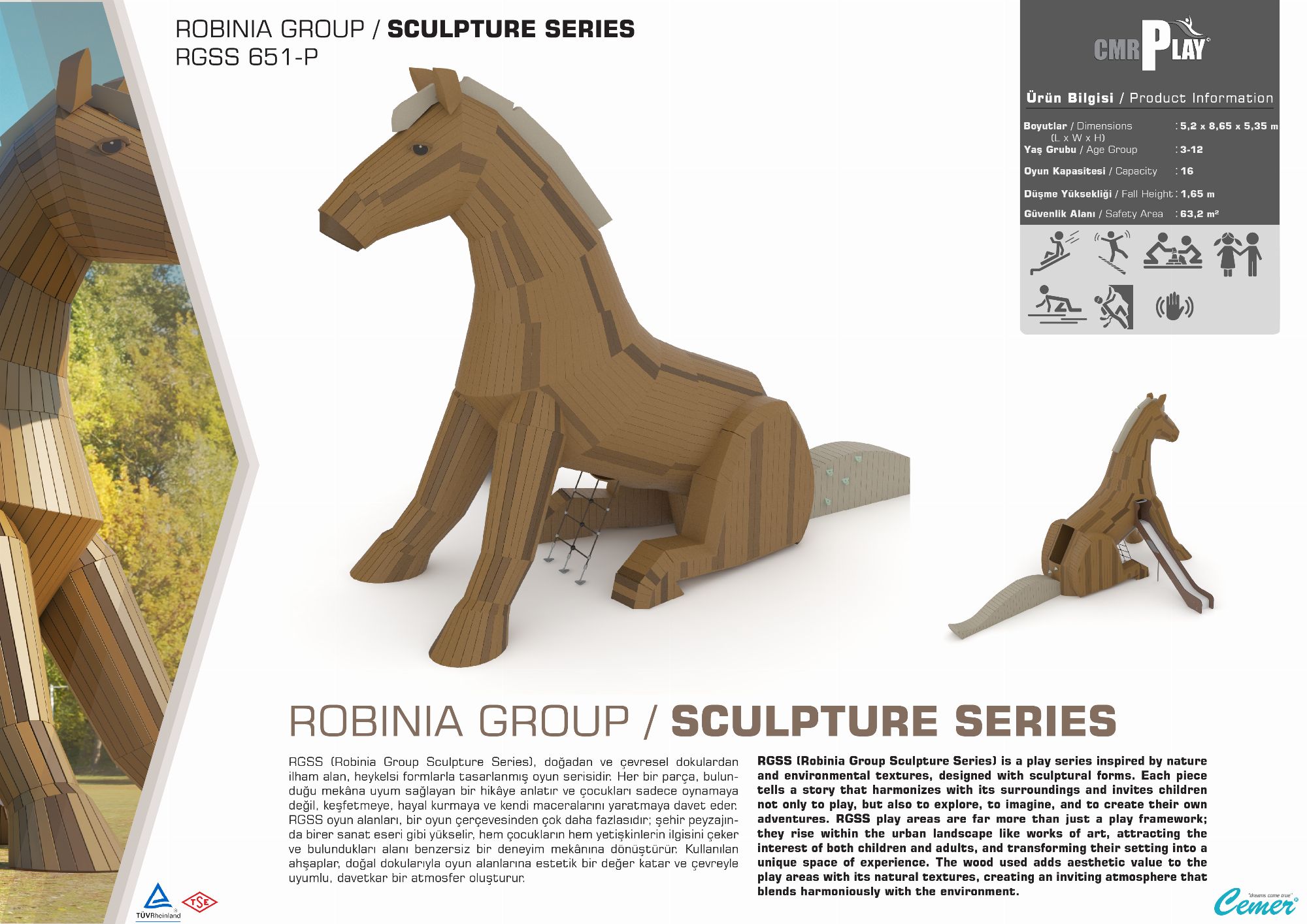 RGSS (Robinia Group Sculpture Series) is a play series inspired by nature and environmental textures, designed with sculptural forms. Each piece tells a story that harmonizes with its surroundings and invites children not only to play, but also to explore, to imagine, and to create their own adventures. RGSS play areas are far more than just a play framework; they rise within the urban landscape like works of art, attracting the interest of both children and adults, and transforming their setting into a unique space of experience. The wood used adds aesthetic value to the play areas with its natural textures, creating an inviting atmosphere that blends harmoniously with the environment.