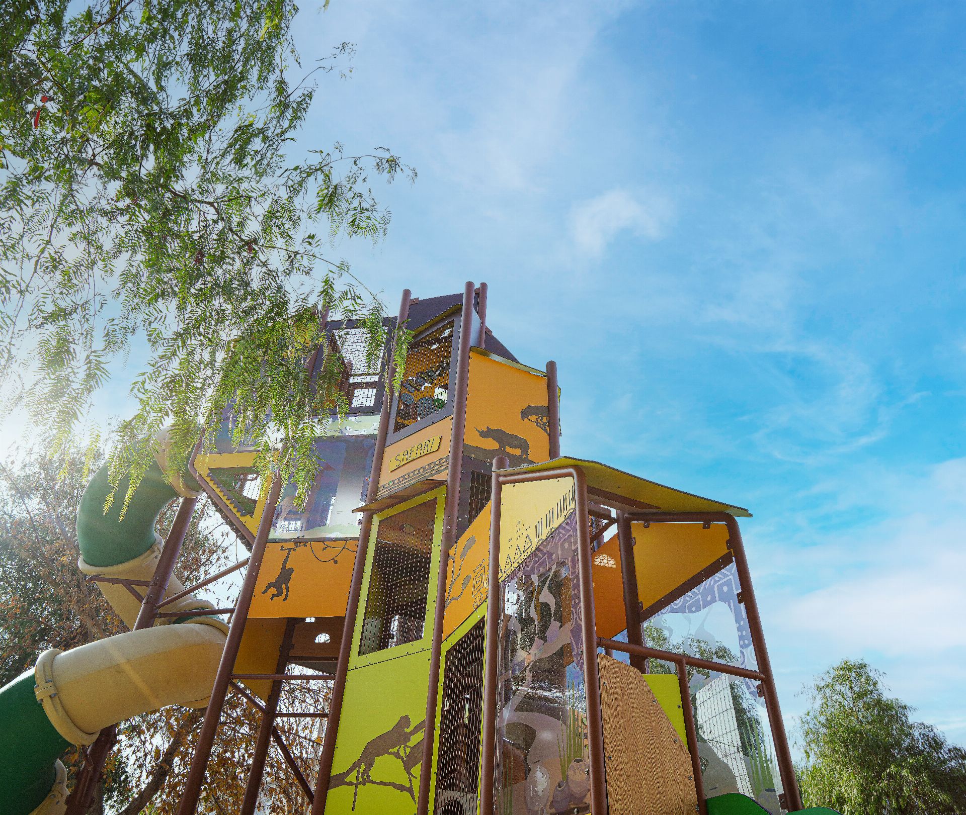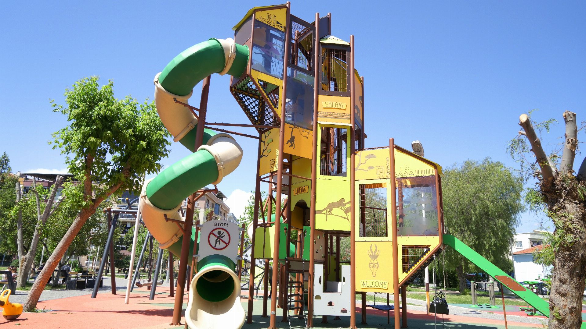 SAFARI SERIES MGSS 201 is a multi-functional playground with a safari-based design that stimulates children's imagination and contributes to their physical development. It is enriched with slides, climbing areas, and panel game elements. With its aesthetic and durable structure, it is suitable for all types of open spaces. The slide is made of two pieces of stainless steel material.