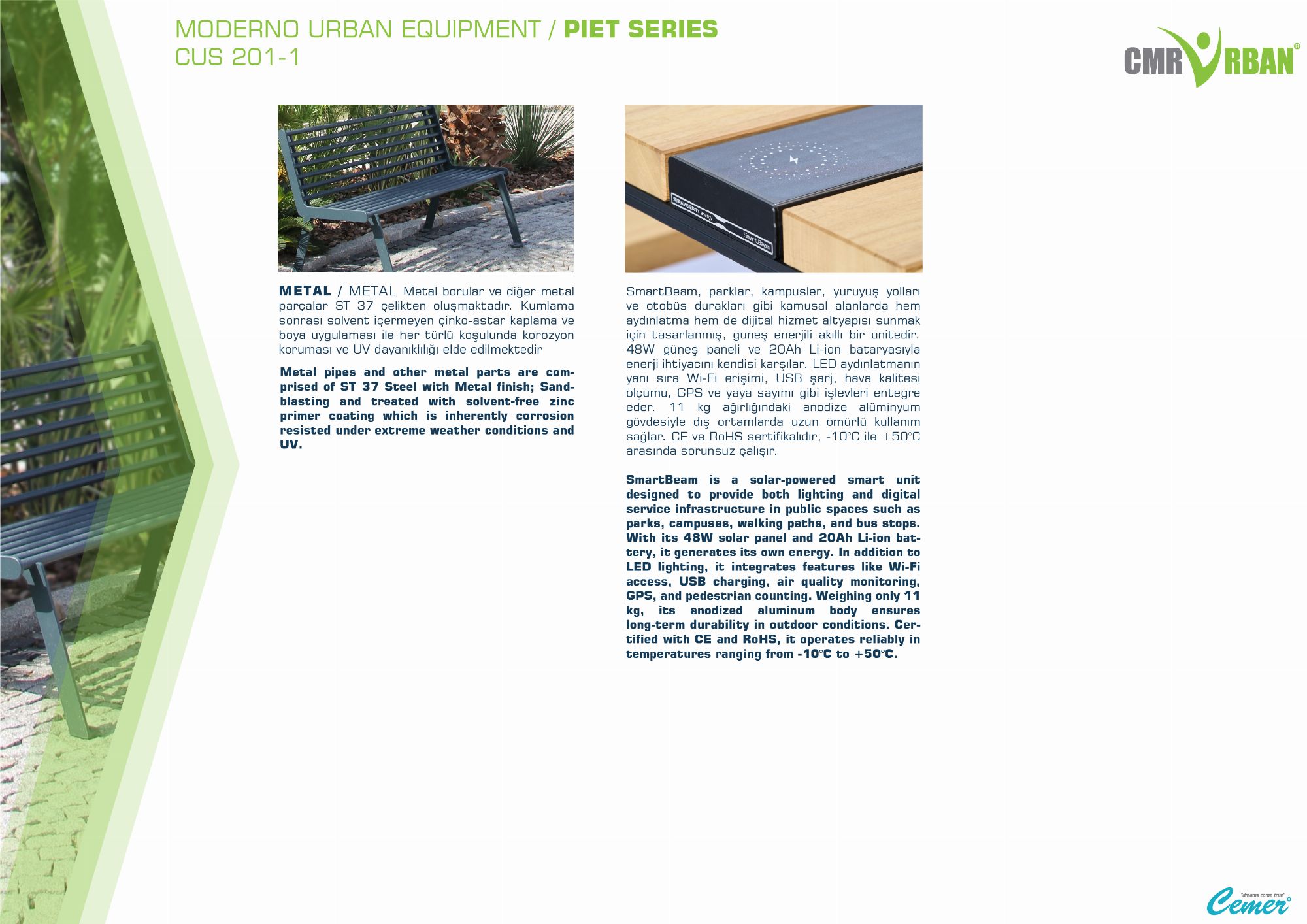 SmartBeam Akıllı Güneş Enerjili Bank, parklar, kampüsler, yürüyüş yolları ve otobüs duraklarında hem konforlu oturma hem de dijital hizmet deneyimi sunan yenilikçi bir kamusal alan çözümüdür. 48W güneş paneli ve 20Ah Li-ion bataryasıyla tamamen kendi enerjisini üreten bu akıllı ünite, LED aydınlatma, Wi-Fi erişimi, USB şarj istasyonu, hava kalitesi monitörü, GPS konumlama ve yaya sayım sensörü gibi gelişmiş özellikleri bir araya getirir. 11 kg anodize alüminyum gövdesiyle her hava koşulunda dayanıklı performans sergileyen SmartBeam, CE ve RoHS sertifikalı olup -10°C ile +50°C arasında sorunsuz çalışarak kamusal alanları akıllı şehir teknolojisinin merkezine dönüştürür.