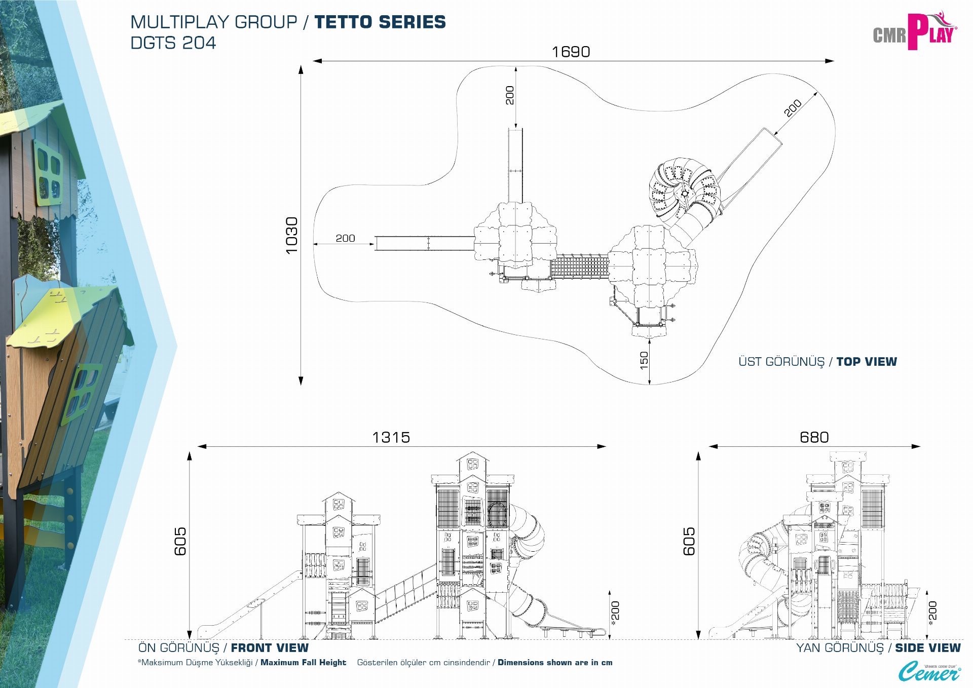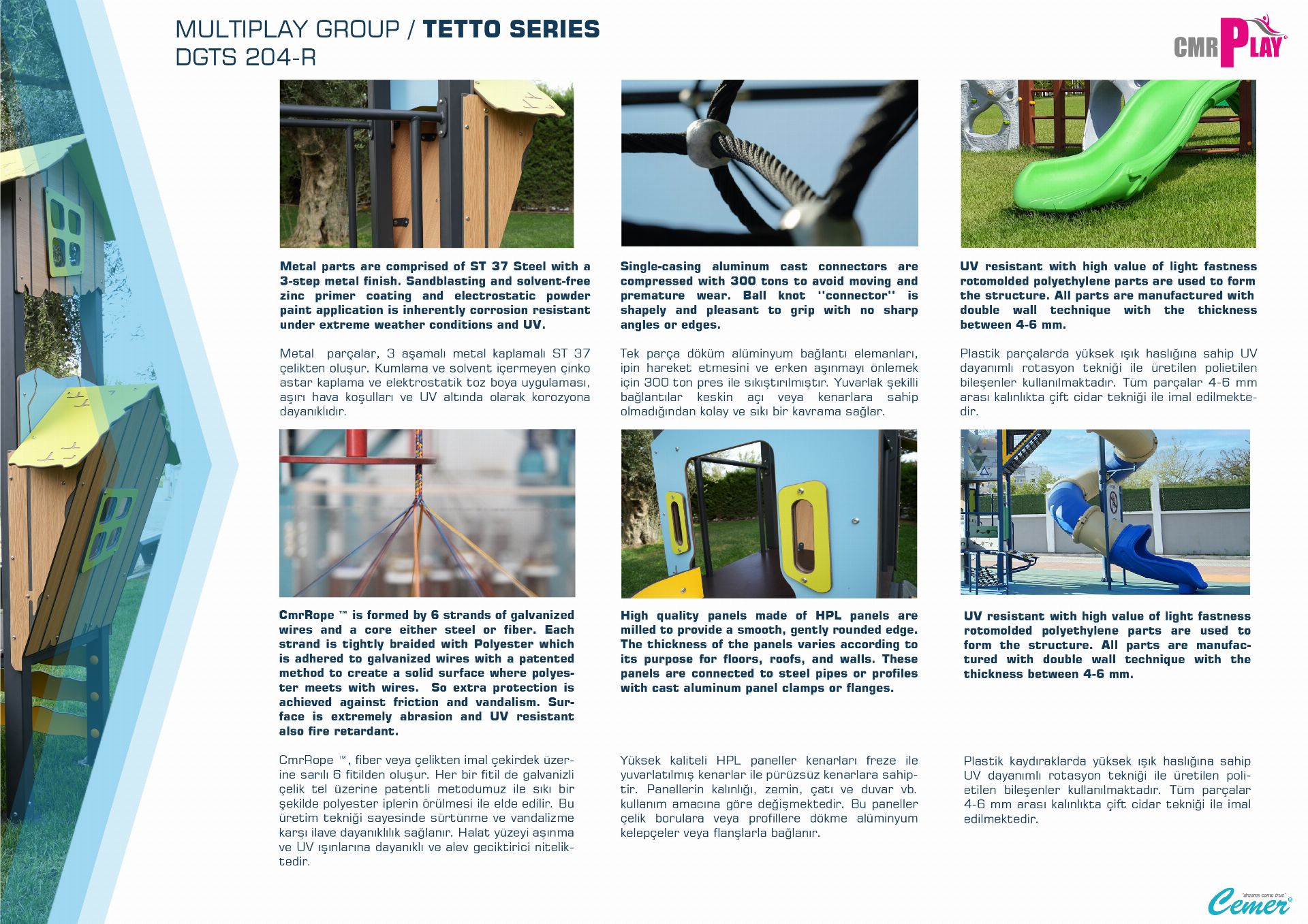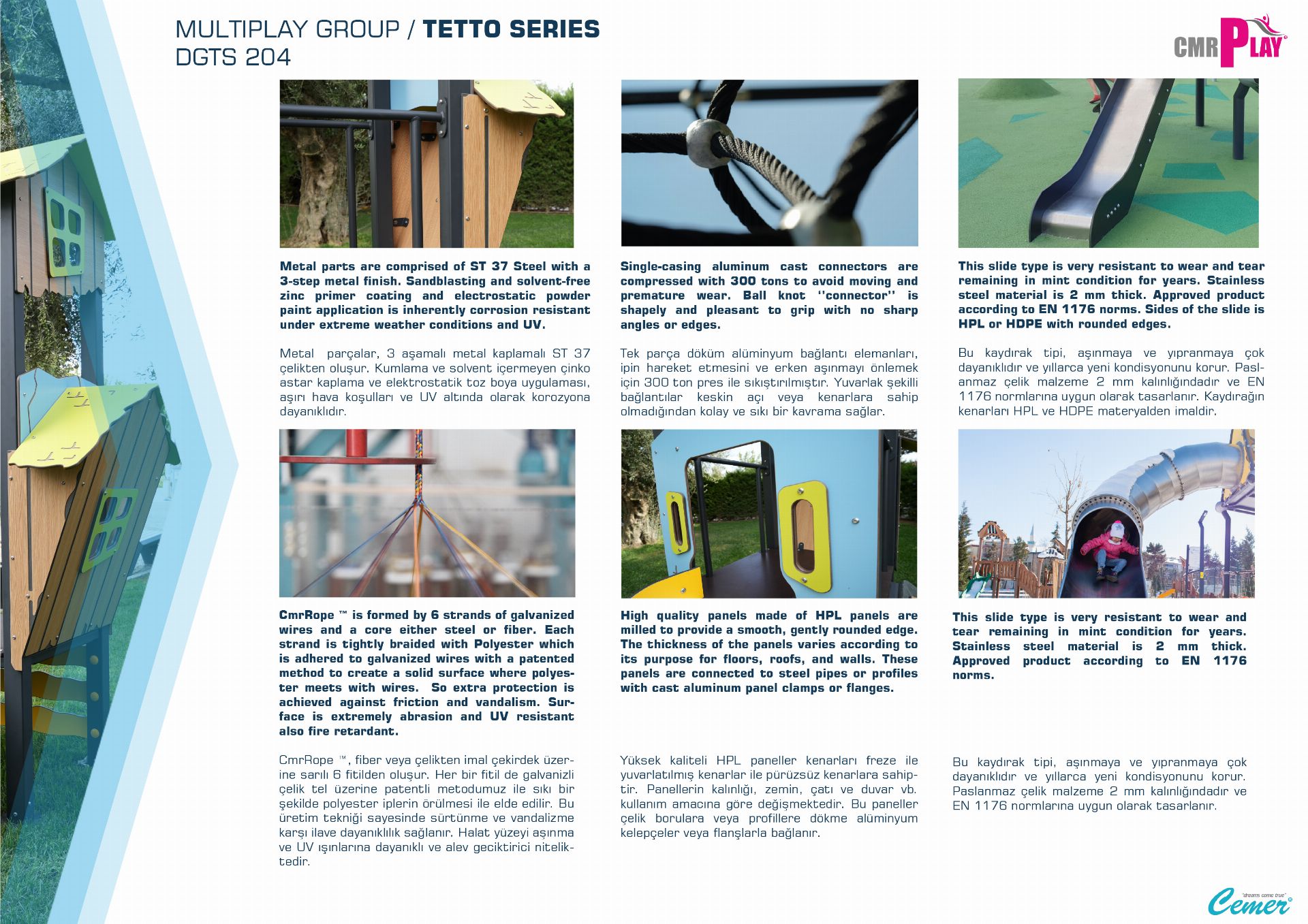 Çocuk Oyun Alanı / Oyun Parkı Tetto Serisi (DGTS 204), çocukların eğlenerek öğrenmesini sağlayan modern bir oyun alanıdır. Zengin oyun aktiviteleri ve güvenli tasarımıyla, çocukların motor becerilerini, koordinasyon yeteneklerini ve sosyal etkileşim becerilerini geliştirir. Renkli yapısı ile çocukların ilgisini çeker, hem eğlenceli hem de öğretici bir oyun ortamı sunar.3 adet paslanmaz çelikten imal edilmiş kaydırağa sahiptir.