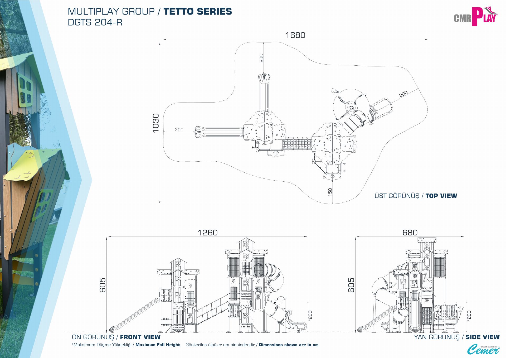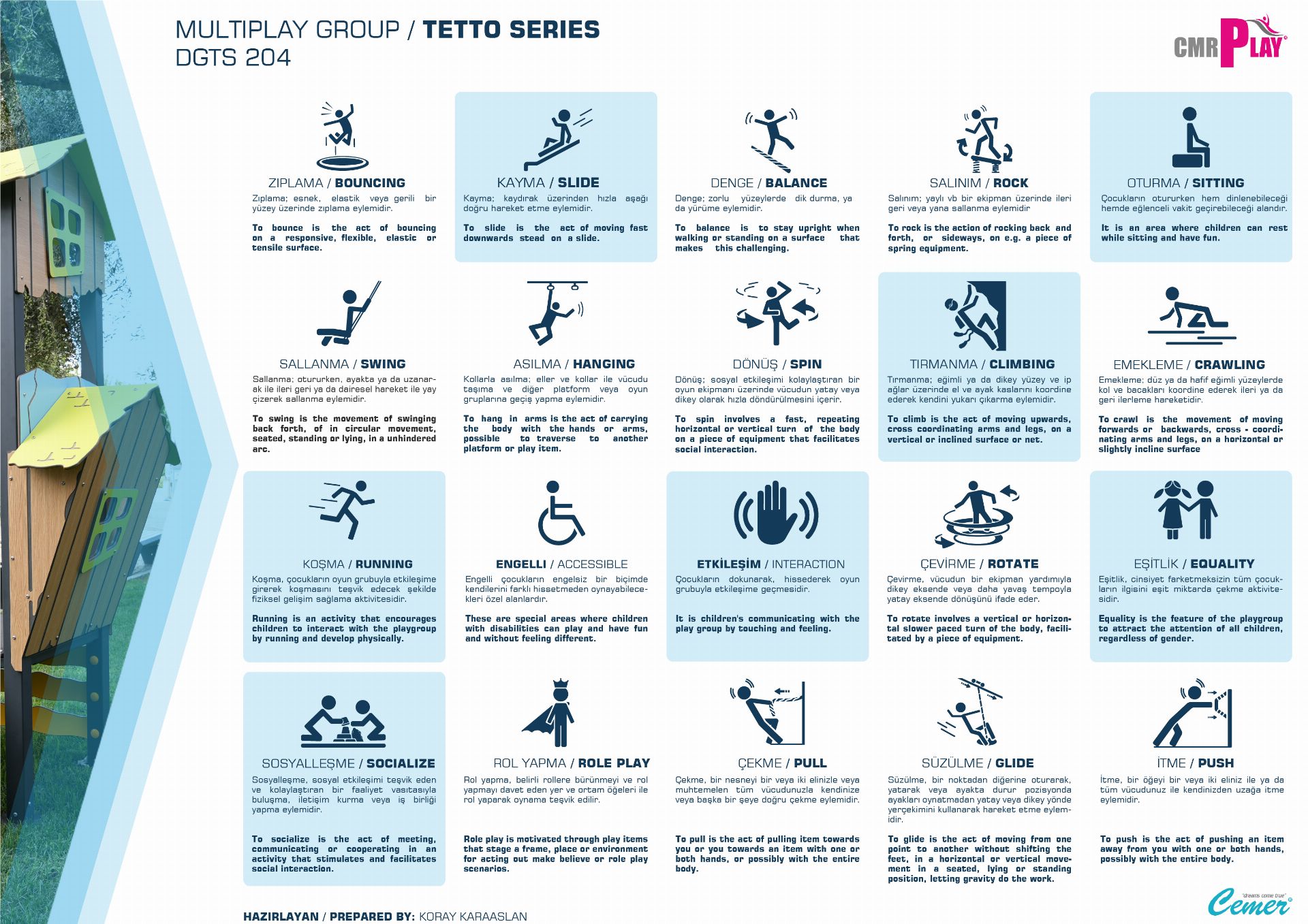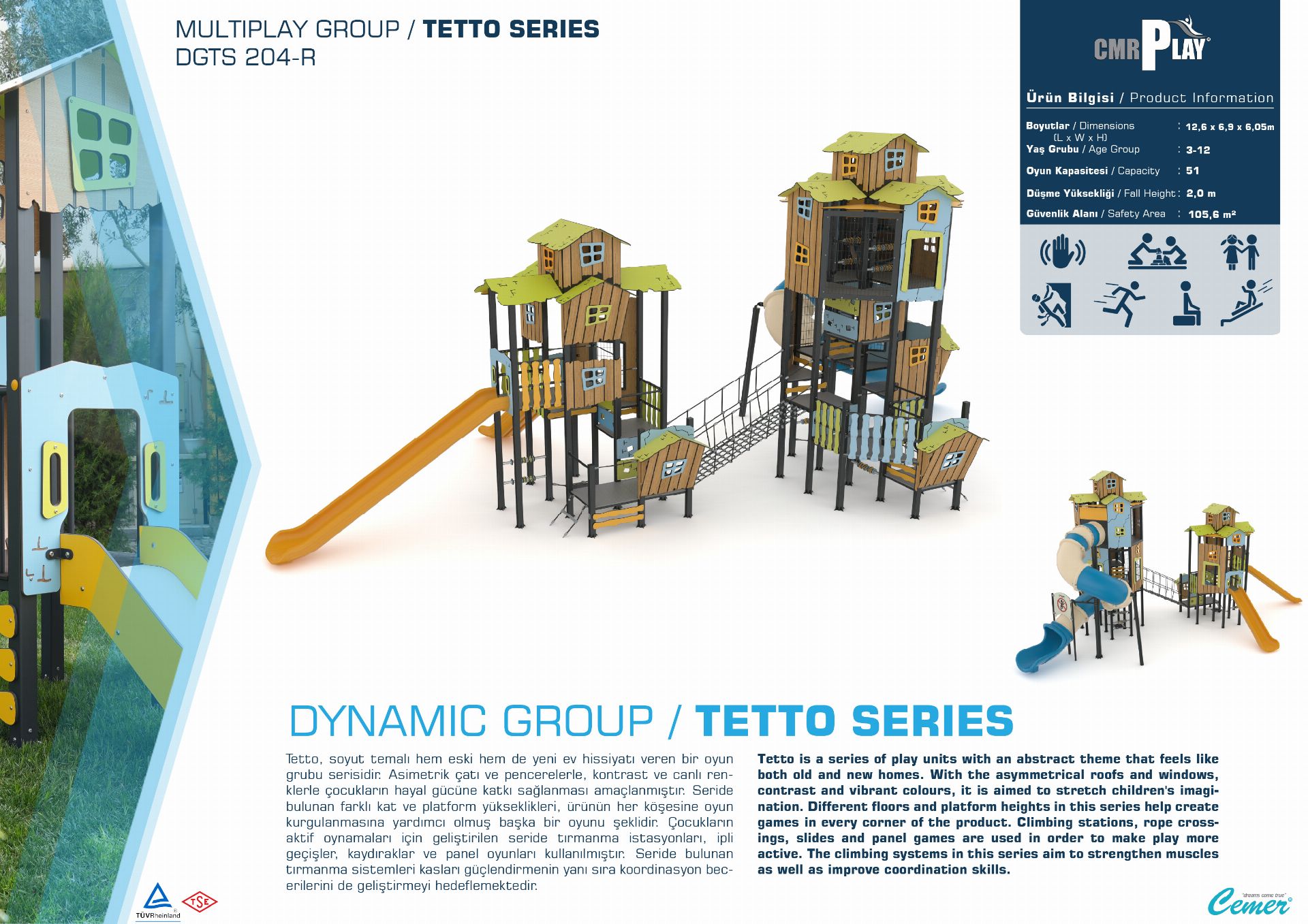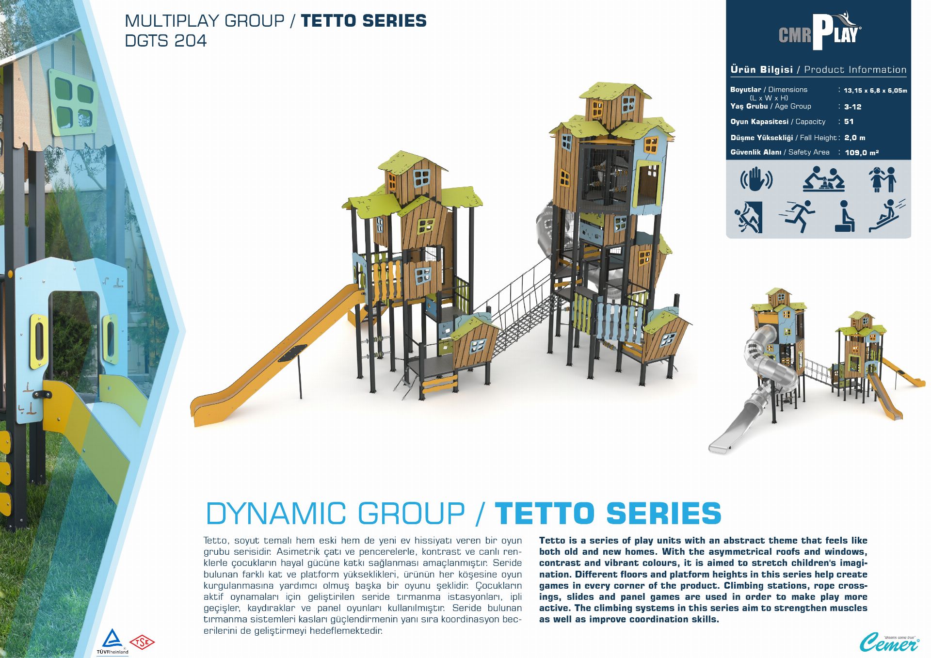 Çocuk Oyun Alanı / Oyun Parkı Tetto Serisi (DGTS 204), çocukların eğlenerek öğrenmesini sağlayan modern bir oyun alanıdır. Zengin oyun aktiviteleri ve güvenli tasarımıyla, çocukların motor becerilerini, koordinasyon yeteneklerini ve sosyal etkileşim becerilerini geliştirir. Renkli yapısı ile çocukların ilgisini çeker, hem eğlenceli hem de öğretici bir oyun ortamı sunar.3 adet paslanmaz çelikten imal edilmiş kaydırağa sahiptir.