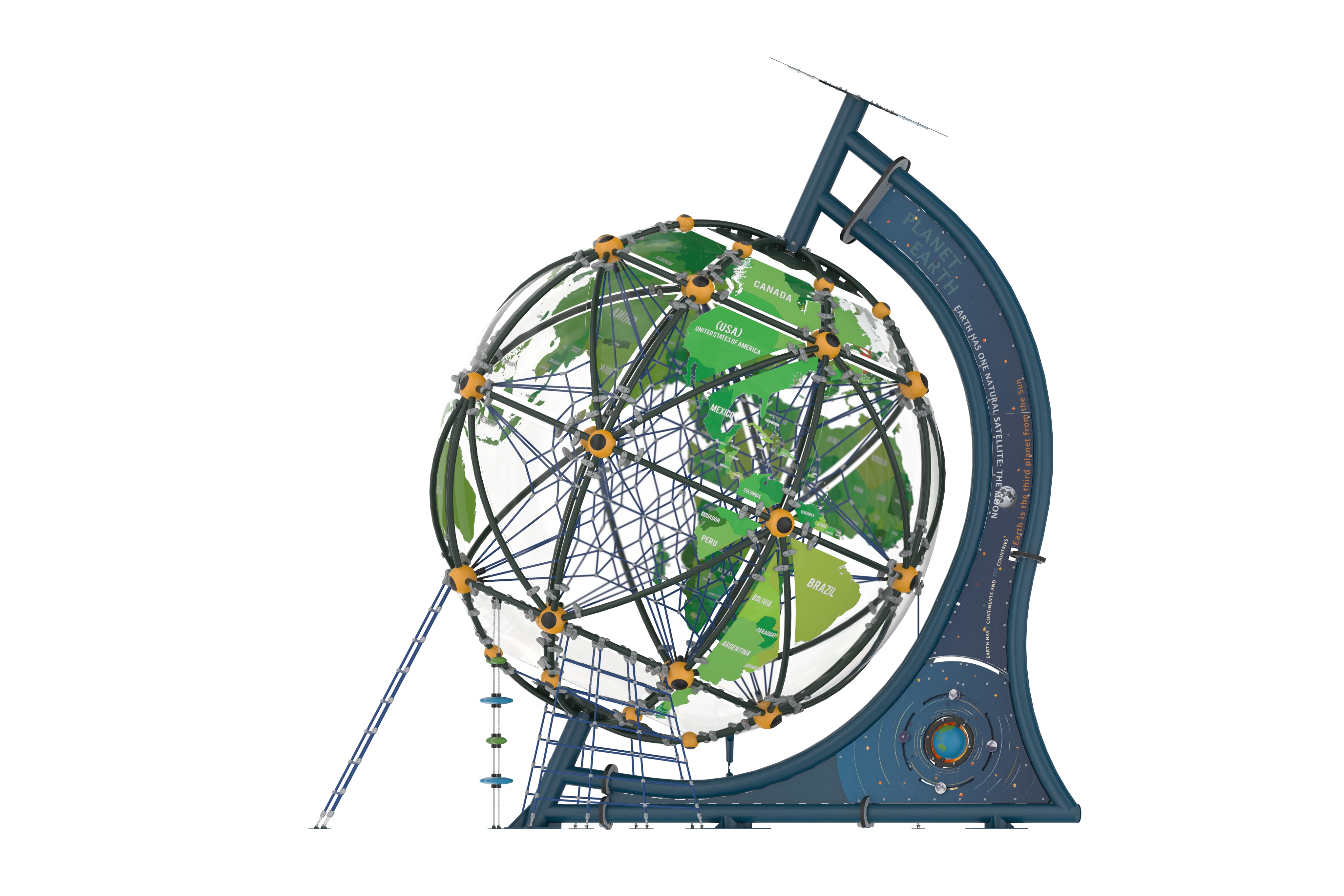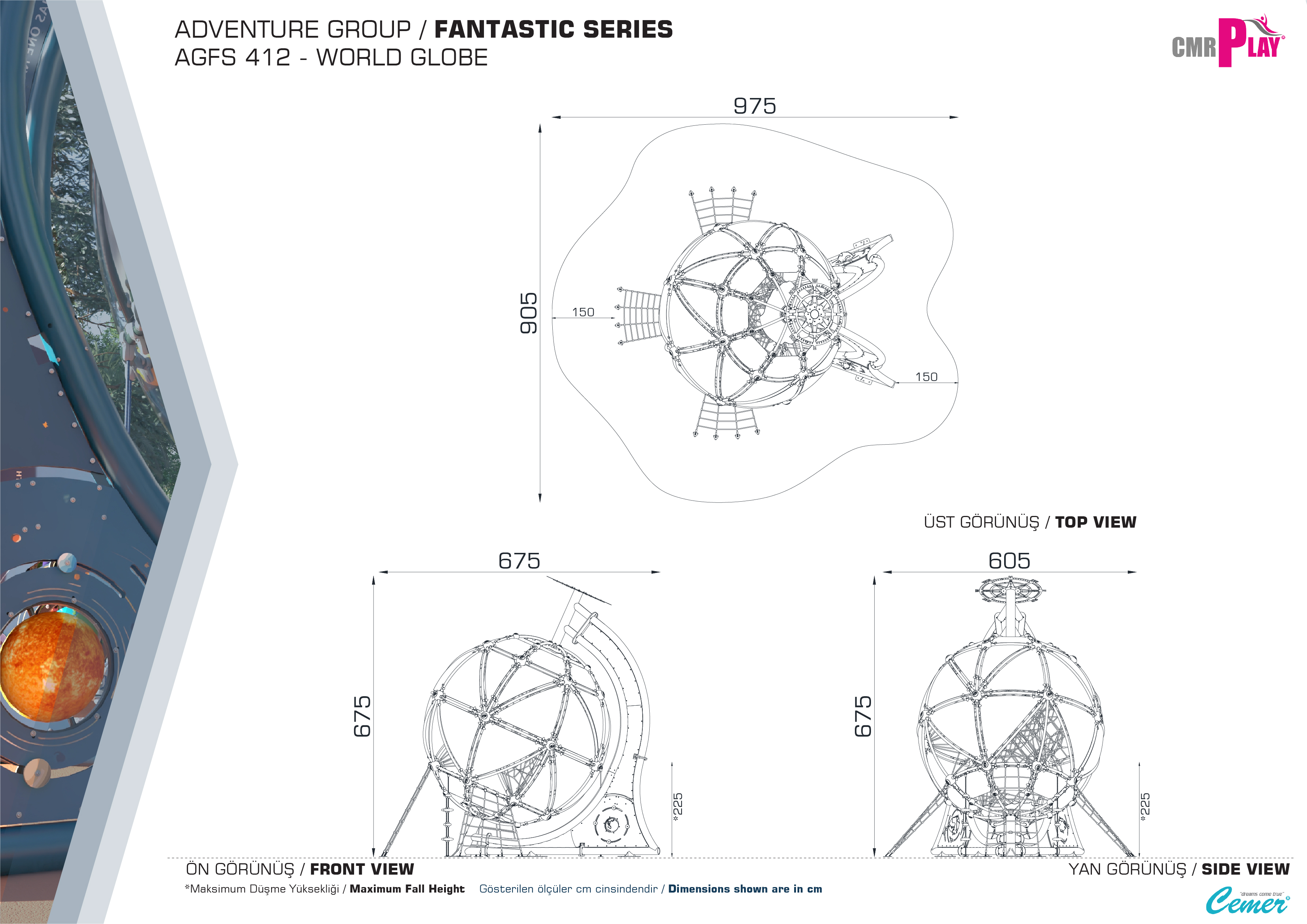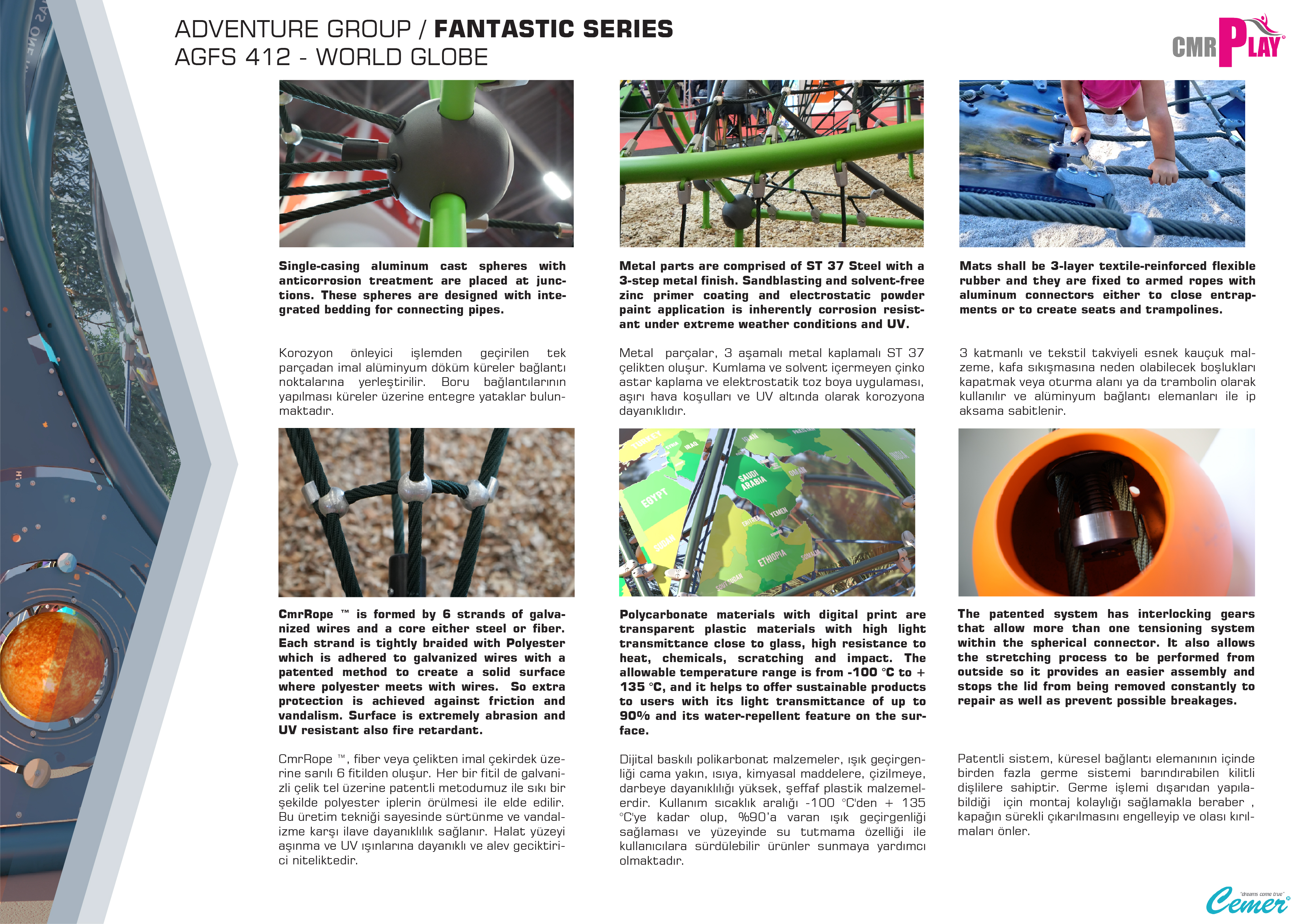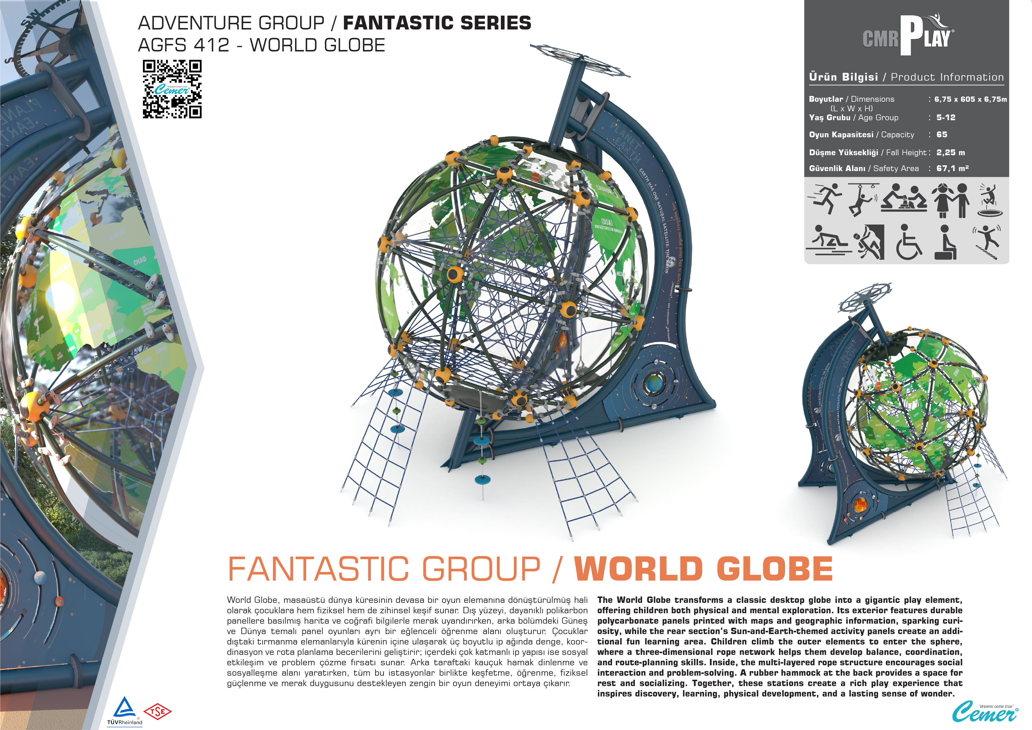 AGFS 412-WORLD GLOBE , Fantastik Serisi'nin en göz alıcı halatlı tırmanma parkıdır. Tasarımı, çocukların fiziksel becerilerini geliştirirken aynı zamanda hayal güçlerini harekete geçirir. Halatlı tırmanma alanları, denge, güç ve koordinasyon gerektiren aktiviteler sunarak çocukların motor becerilerini güçlendirir. Çocuklar, farklı yüksekliklerdeki tırmanma halatlarıyla eğlenceli deneyim yaşarlar.