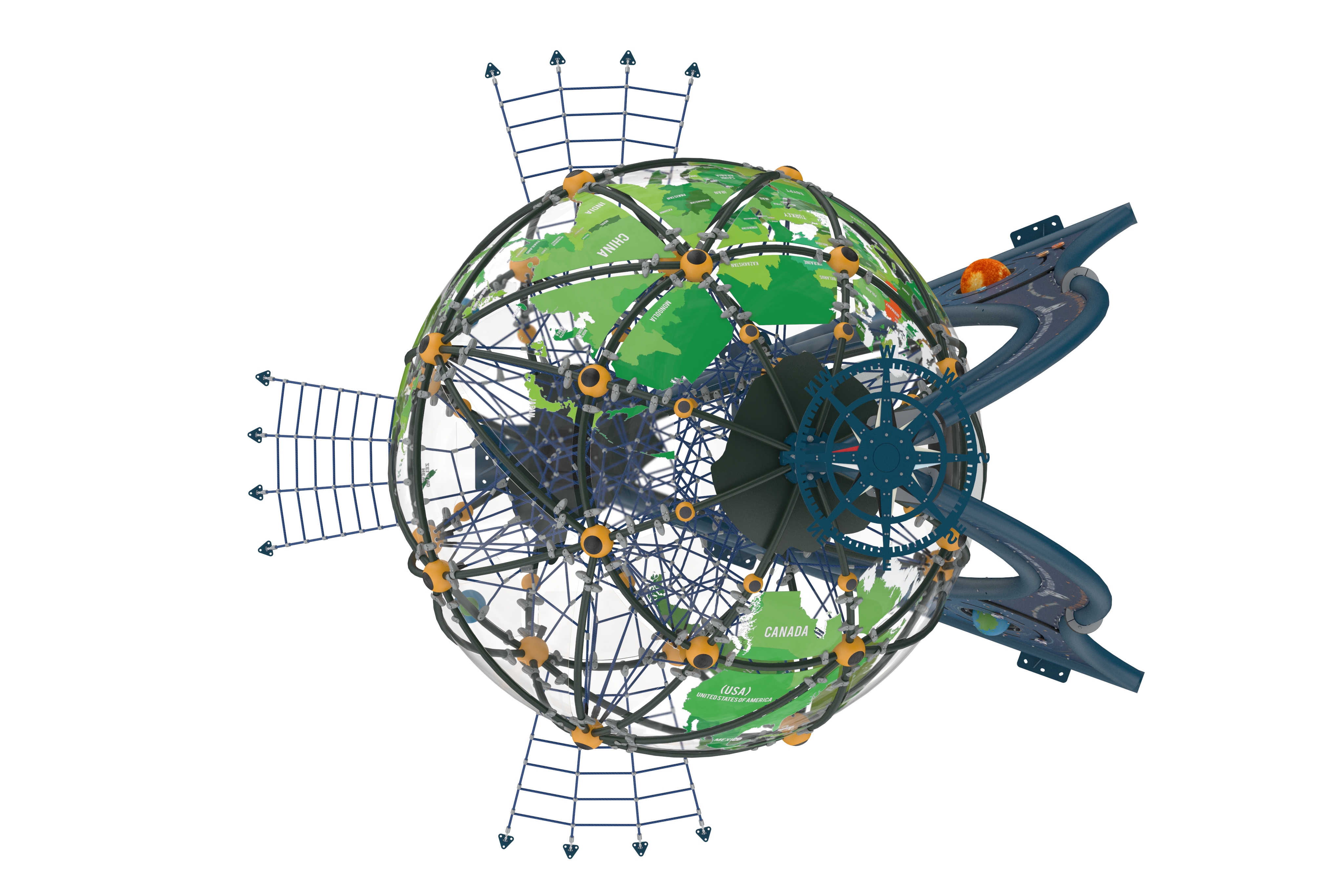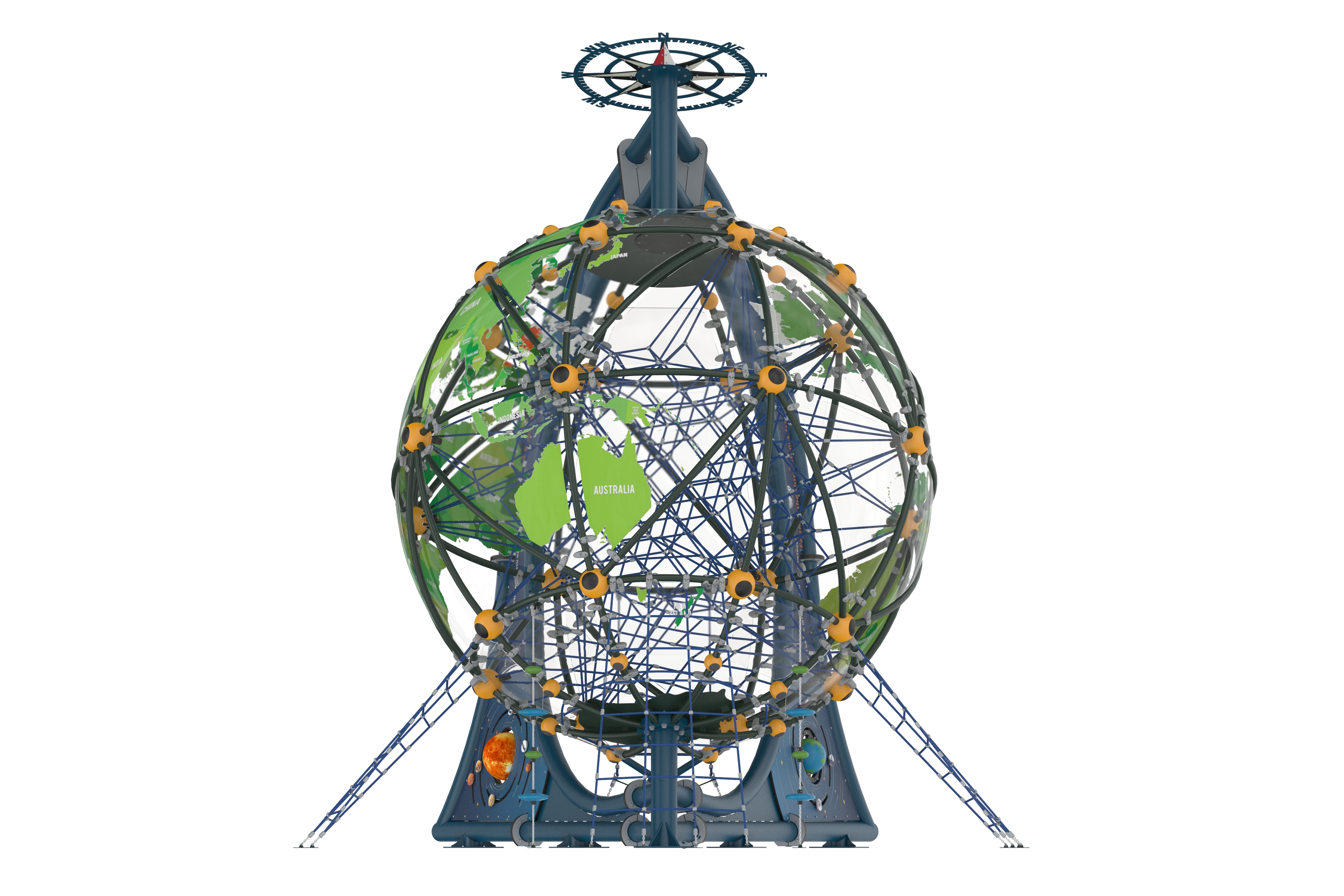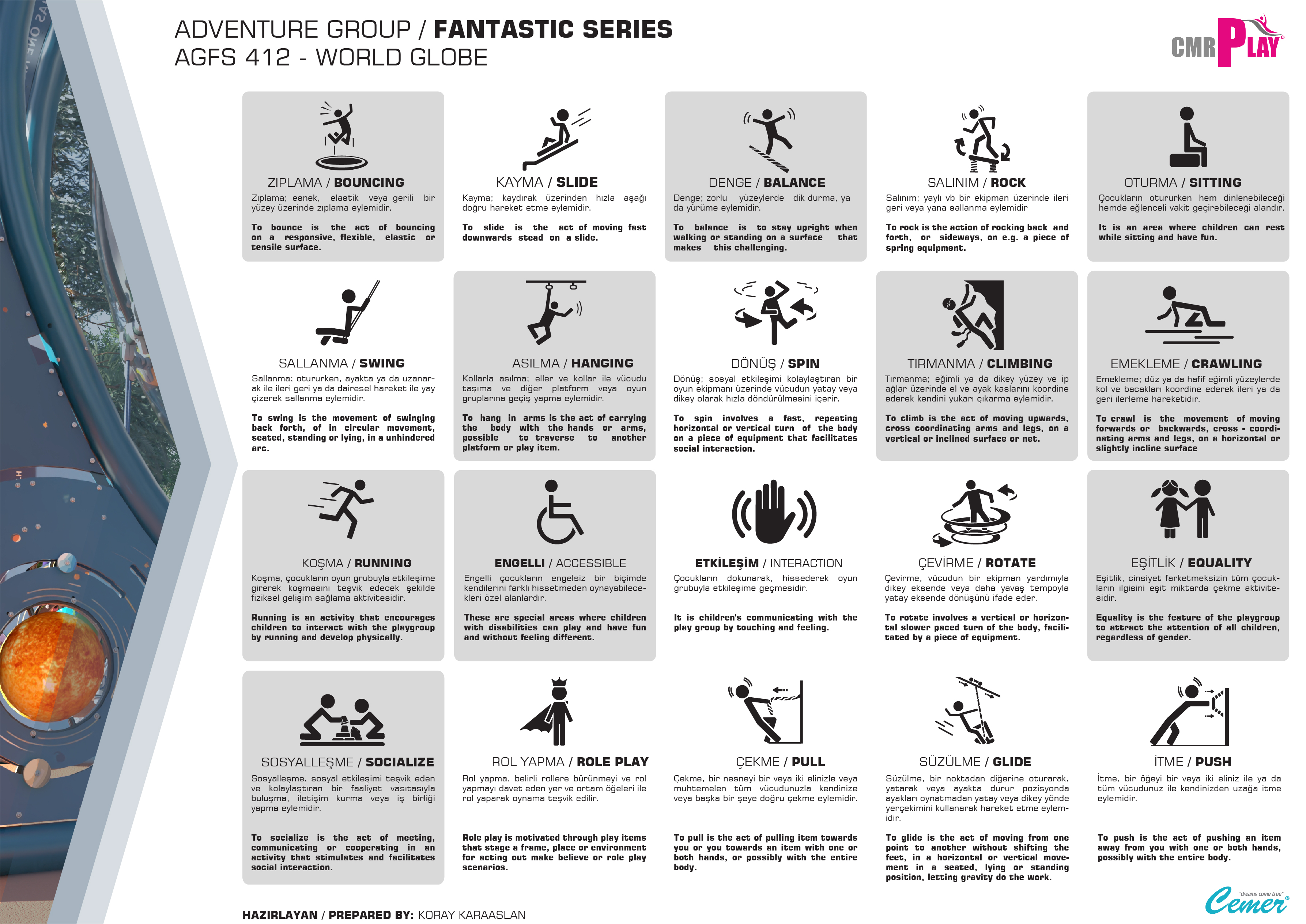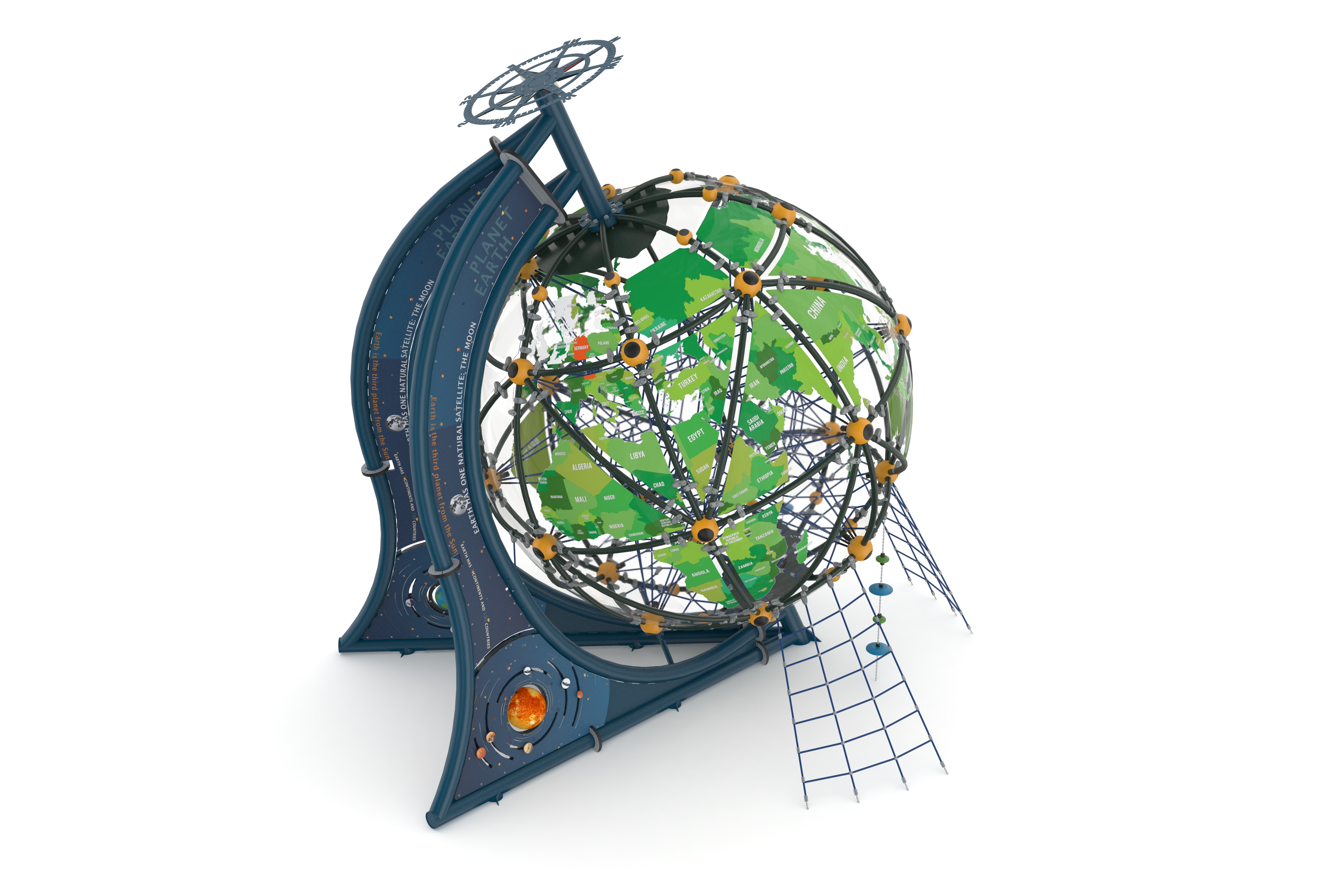 AGFS 412-WORLD GLOBE , Fantastik Serisi'nin en göz alıcı halatlı tırmanma parkıdır. Tasarımı, çocukların fiziksel becerilerini geliştirirken aynı zamanda hayal güçlerini harekete geçirir. Halatlı tırmanma alanları, denge, güç ve koordinasyon gerektiren aktiviteler sunarak çocukların motor becerilerini güçlendirir. Çocuklar, farklı yüksekliklerdeki tırmanma halatlarıyla eğlenceli deneyim yaşarlar.