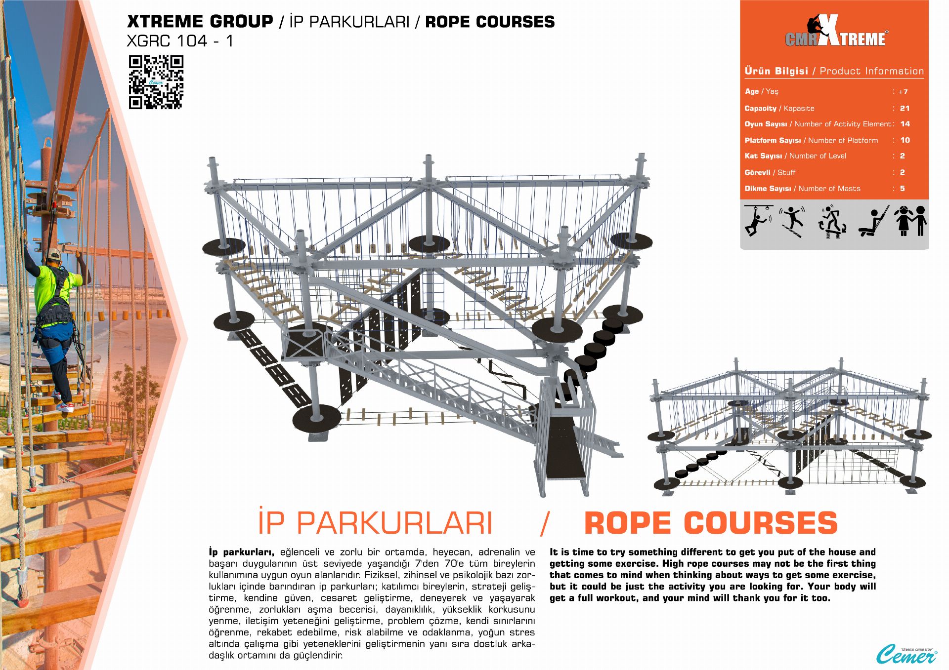 İp Parkurları XGRC 104-1, macera severler için özel olarak tasarlanmış, fiziksel ve zihinsel becerileri geliştirmeye yönelik dinamik bir oyun grubudur. Bu parkur, denge, hız ve koordinasyon gerektiren çeşitli zorluk seviyelerindeki ip geçişleriyle kullanıcıların strateji geliştirme, özgüven kazanma ve cesaretlerini artırma gibi yeteneklerini pekiştirir. 7'den 70'e tüm bireylerin eğlenceli ve güvenli bir ortamda heyecan ve adrenalin dolu anlar yaşamasını sağlar.
