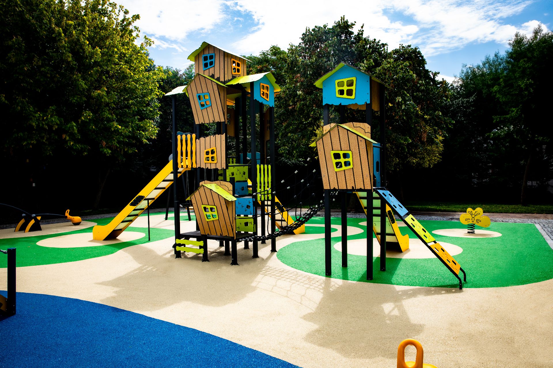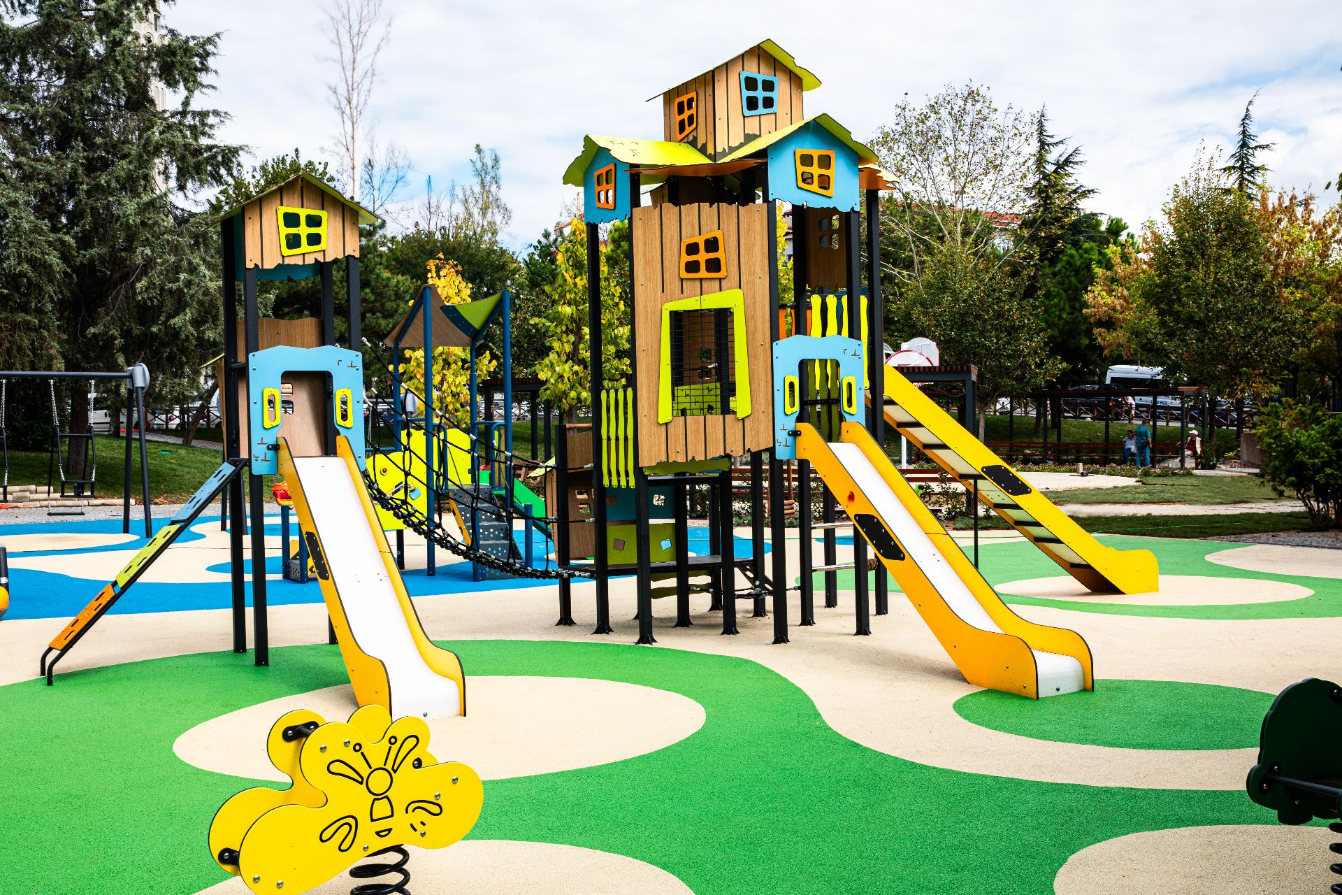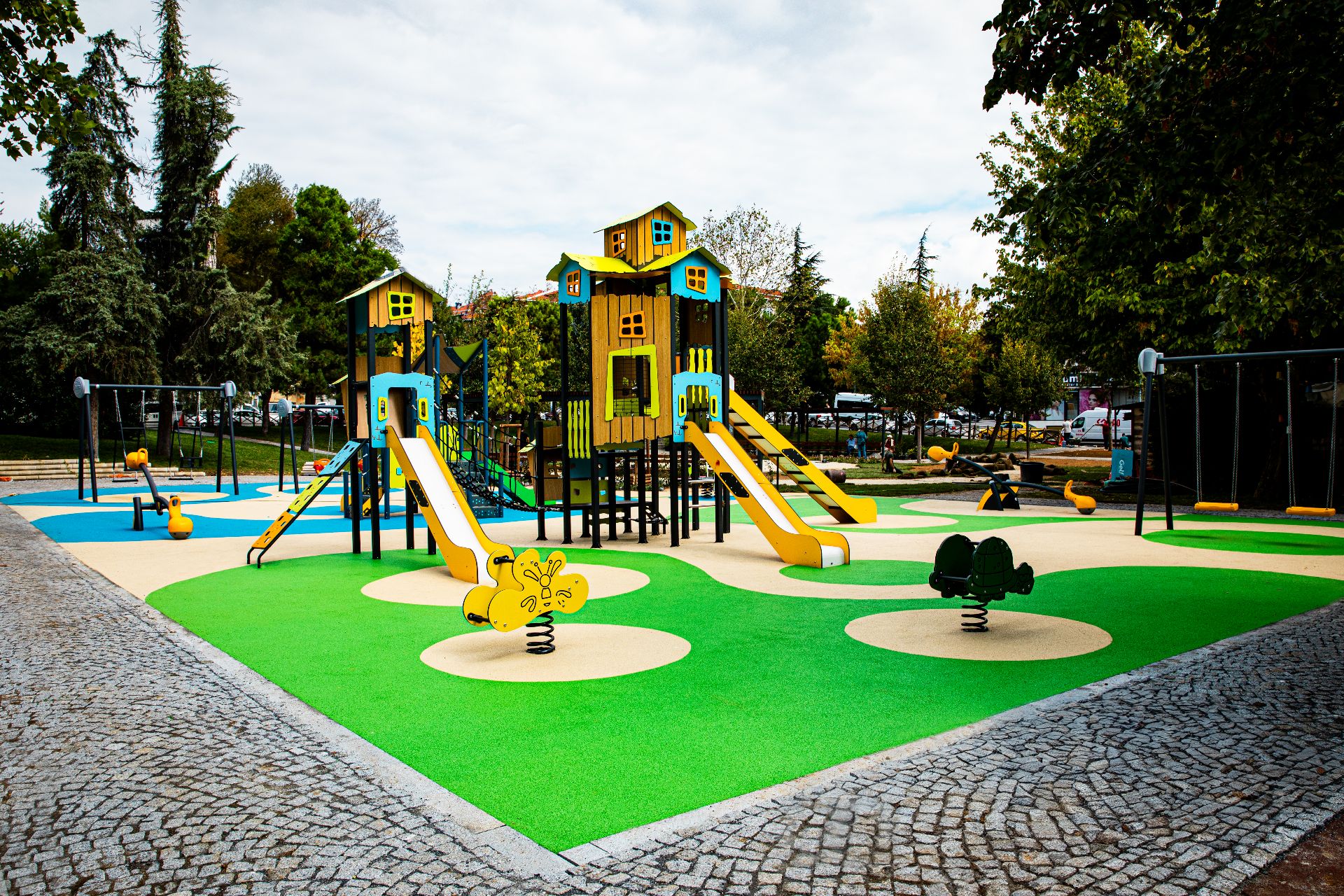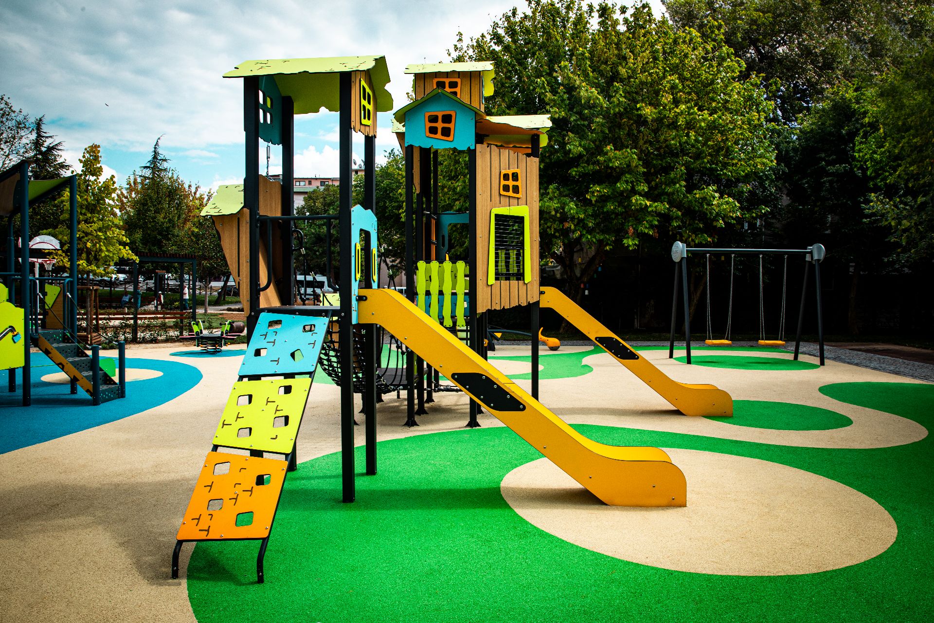 Bu modern çocuk oyun parkı, güvenli kauçuk zemin kaplaması ve renkli tasarımıyla dikkat çekiyor. Kaydırak, salıncak, tahterevalli ve çok katlı oyun evleri sayesinde çocukların motor becerilerini geliştirirken aynı zamanda eğlenceli ve sosyal bir oyun deneyimi sunuyor.