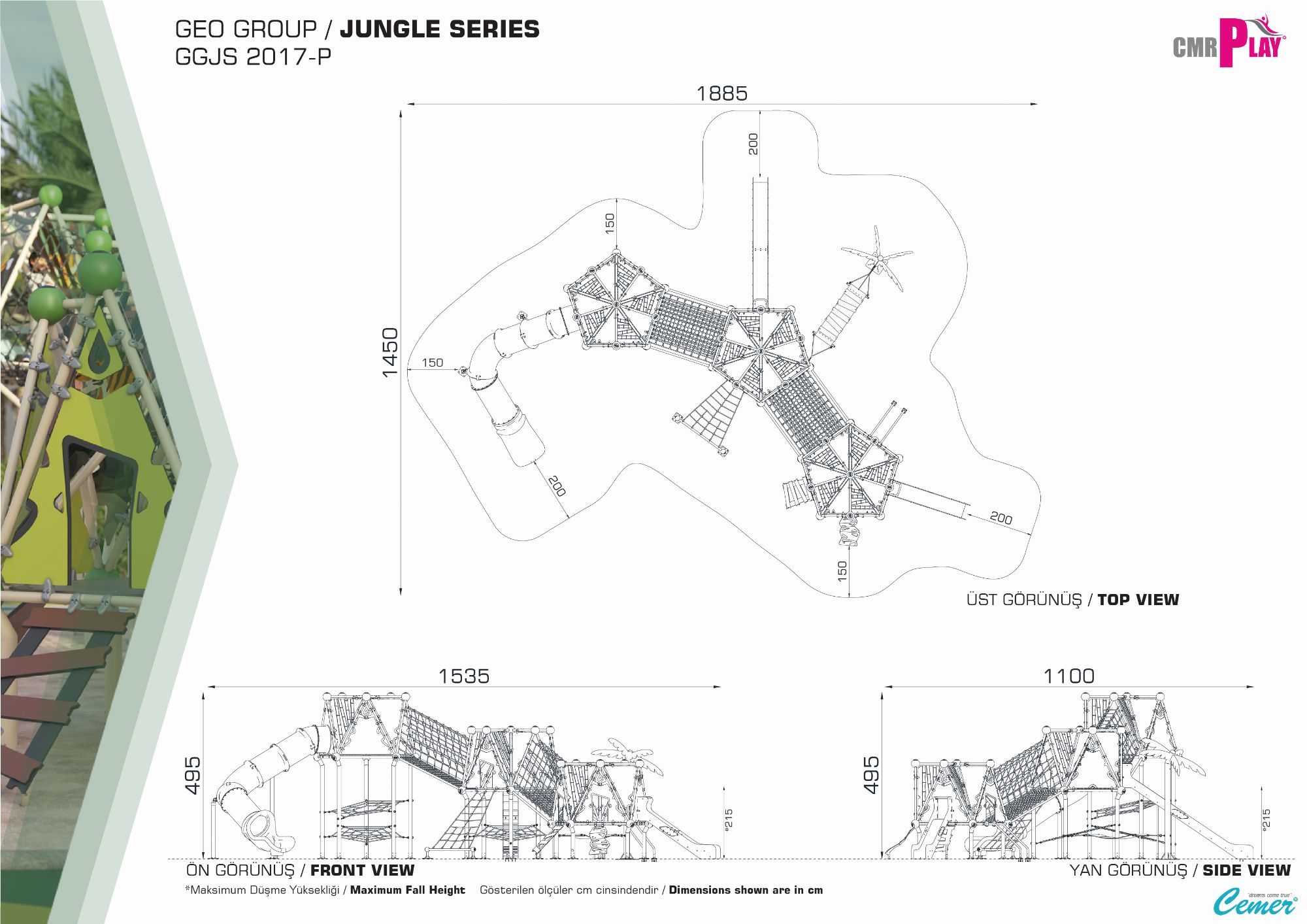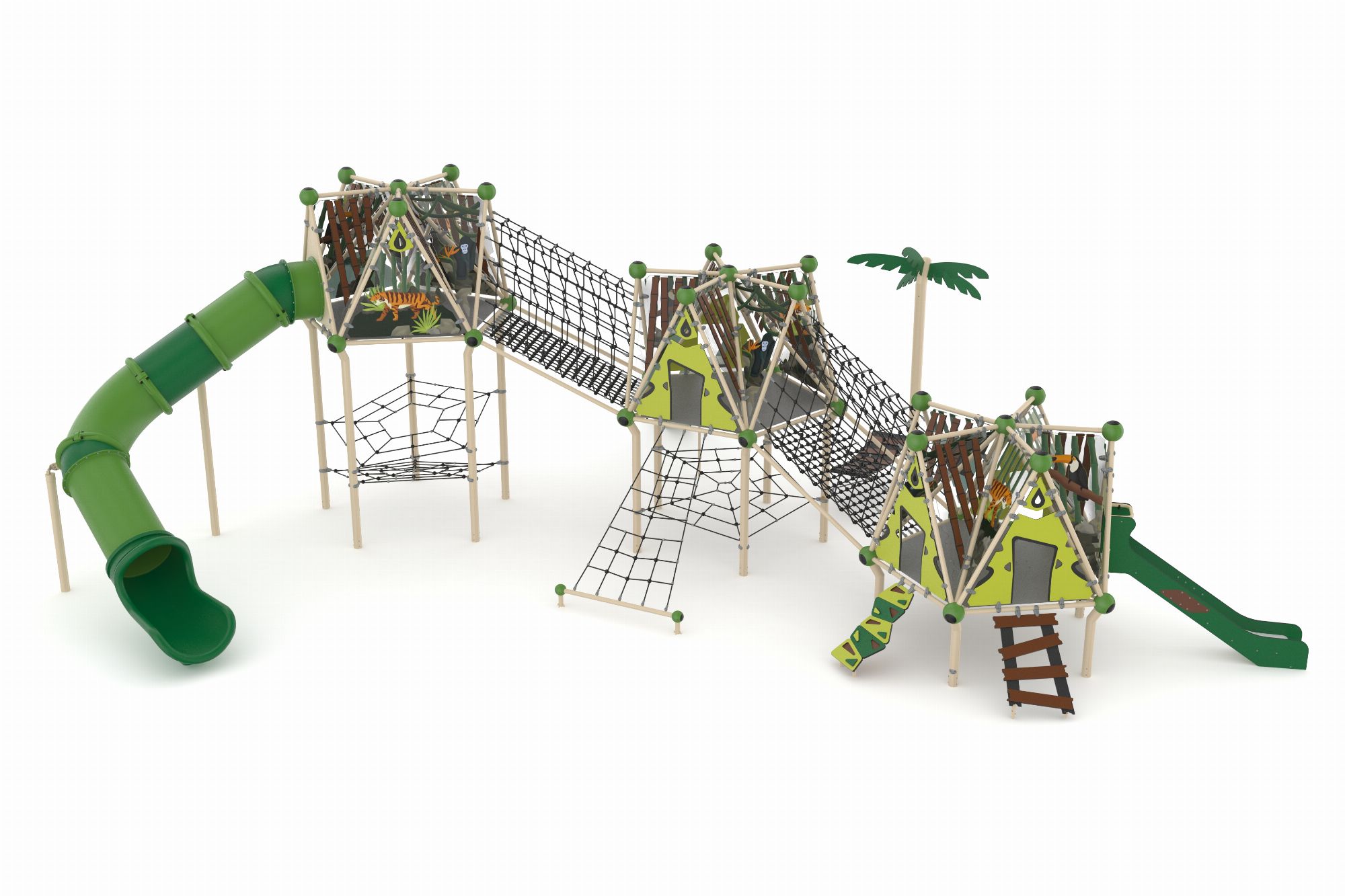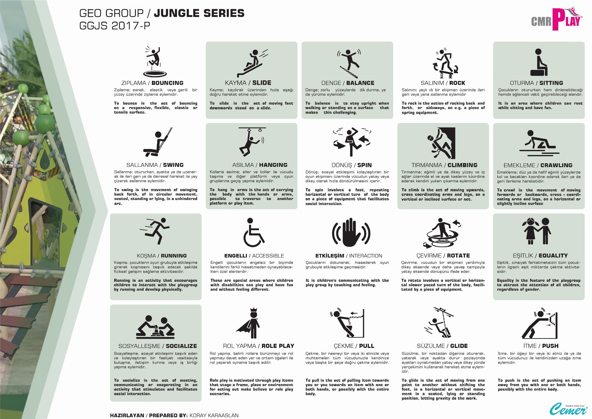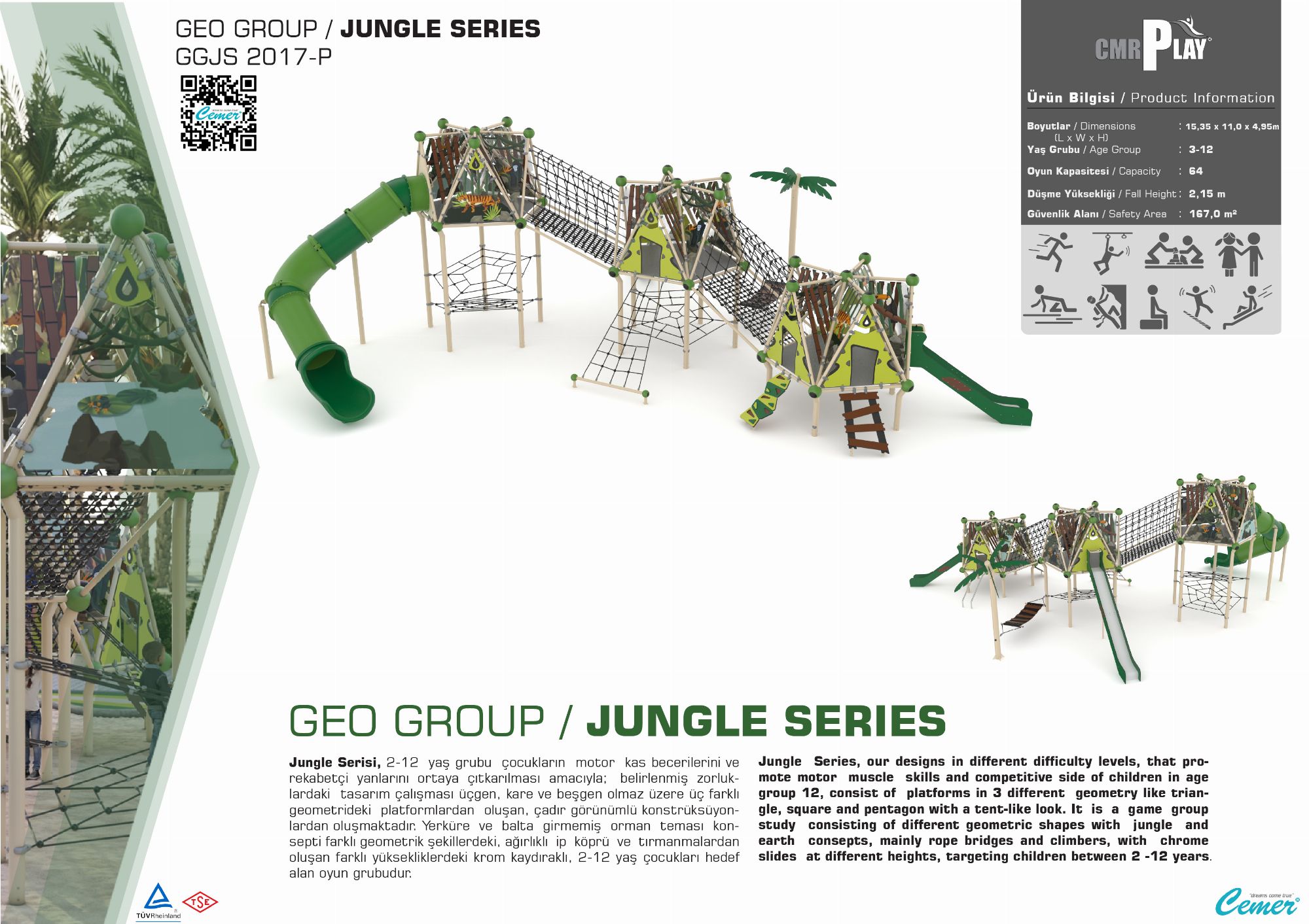 GGJS 2017-P Temalı Oyun Parkı Grubu, Jungle Serisi'nin enerjik ve doğal tasarımını yansıtan eğlenceli bir oyun alanıdır. Çocukların hem fiziksel gelişimlerini destekler hem de eğlenceli vakit geçirmelerini sağlar. Orman temasını benimseyen tasarımı sayesinde çocukların doğa ile ilgili farkındalıklarını artırır. Dayanıklı malzemelerden üretilmiş olup, dış mekanlarda uzun ömürlü kullanım sunar. 1 adet çift cidarlı plastik kaydırak 2 adet HDPE malzemeden üretilmiş kaydırak vardır.