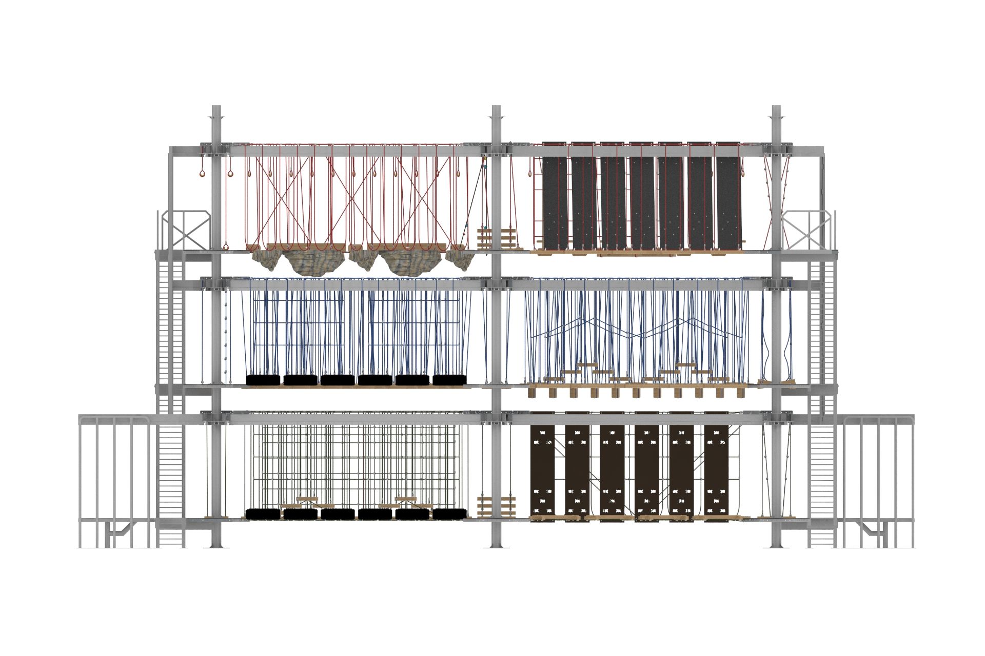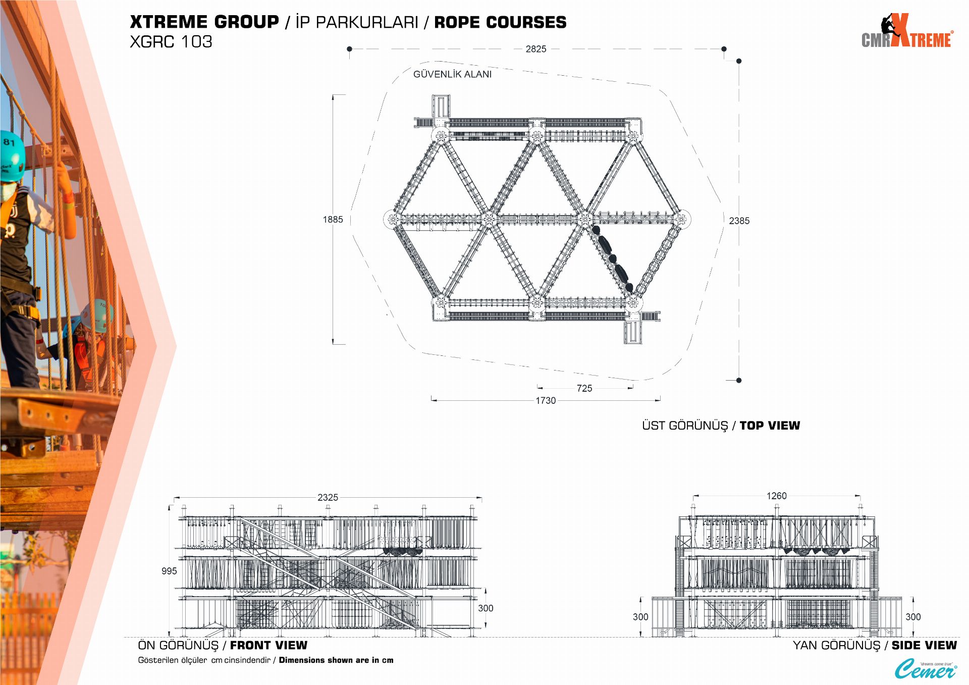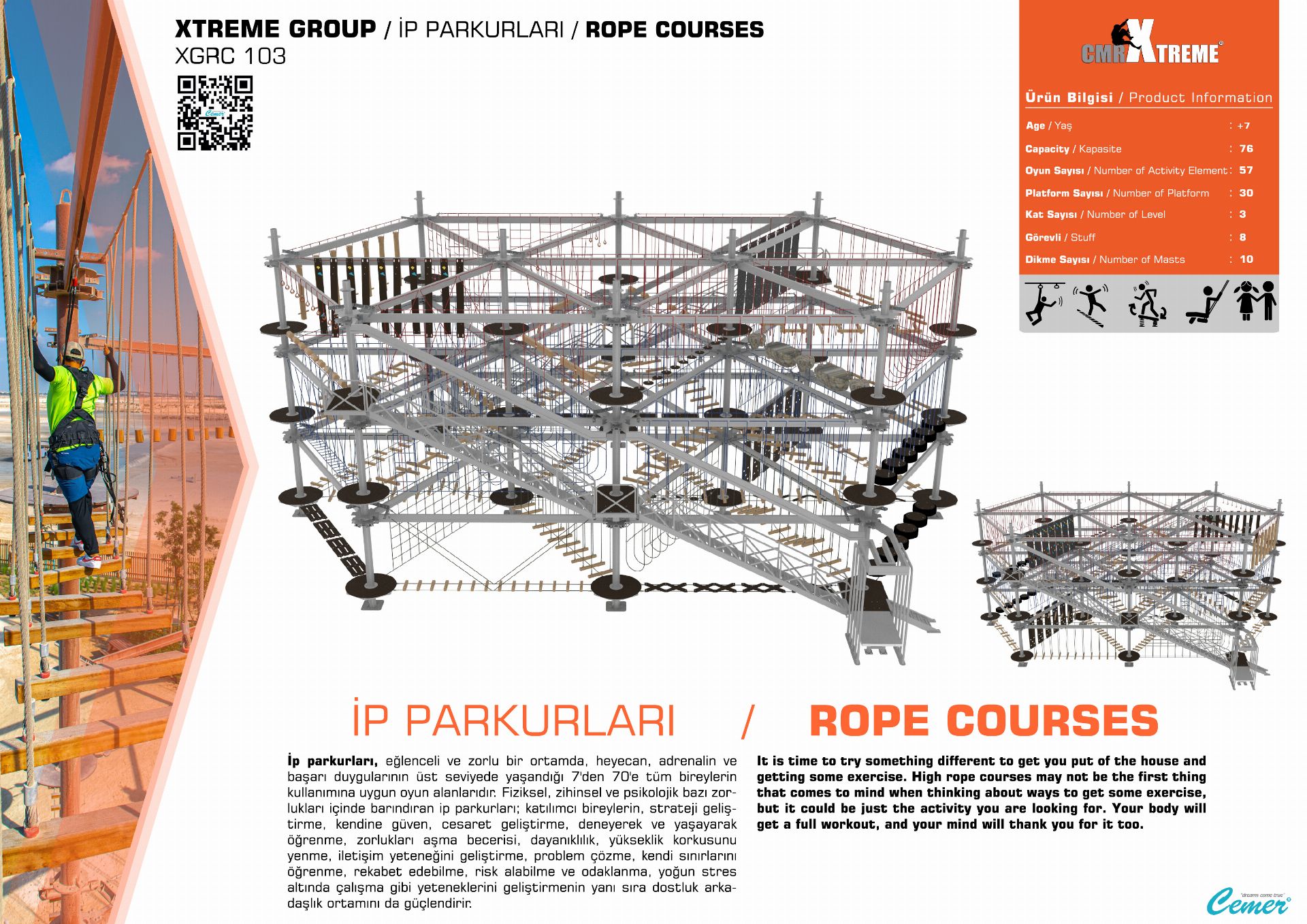 XGRC 103, macera severler için özel olarak tasarlanmış, fiziksel ve zihinsel becerileri geliştirmeye yönelik dinamik bir oyun grubudur. Bu parkur, denge, hız ve koordinasyon gerektiren çeşitli zorluk seviyelerindeki ip geçişleriyle kullanıcıların strateji geliştirme, özgüven kazanma ve cesaretlerini artırma gibi yeteneklerini pekiştirir. 7'den 70'e tüm bireylerin eğlenceli ve güvenli bir ortamda heyecan ve adrenalin dolu anlar yaşamasını sağlar.