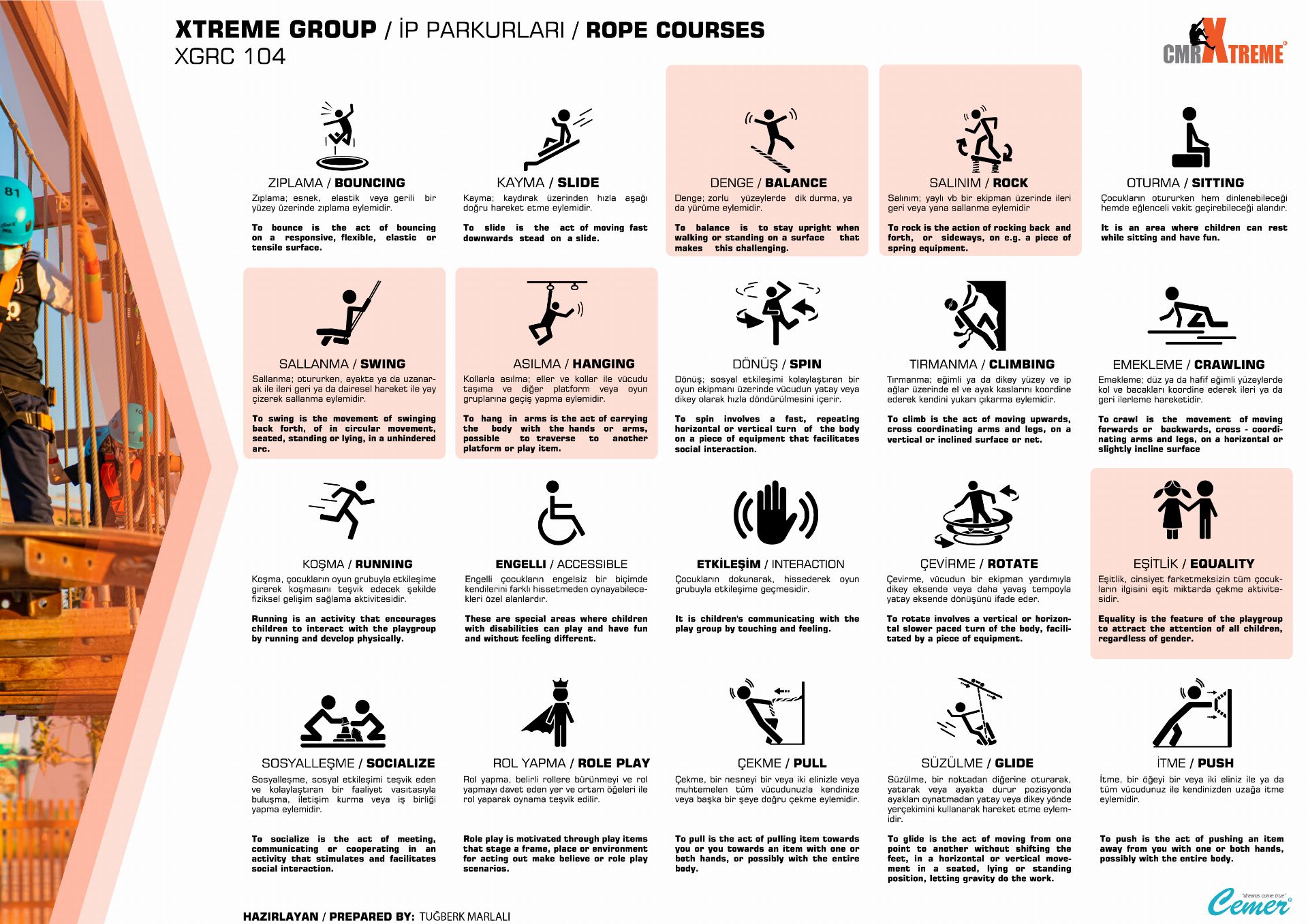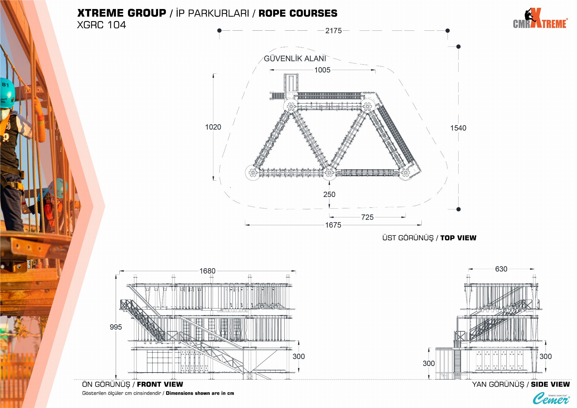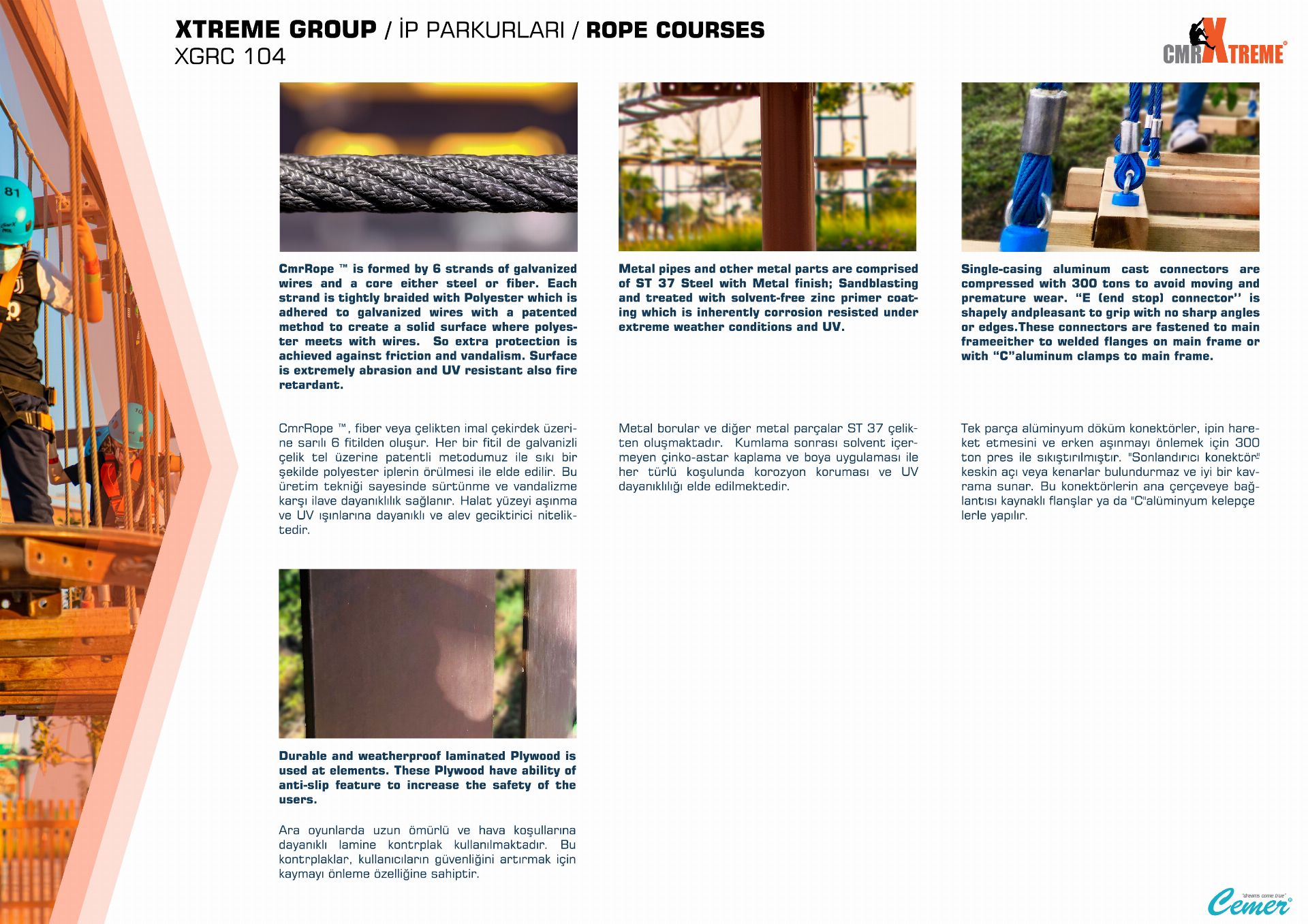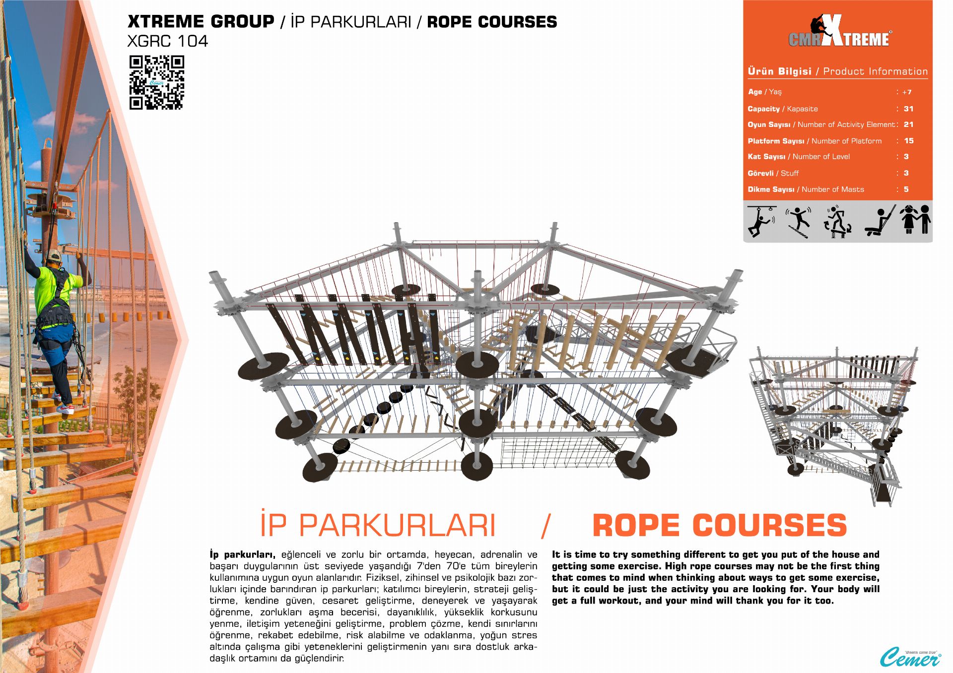 XGRC 104, macera severler için özel olarak tasarlanmış, fiziksel ve zihinsel becerileri geliştirmeye yönelik dinamik bir oyun grubudur. Bu parkur, denge, hız ve koordinasyon gerektiren çeşitli zorluk seviyelerindeki ip geçişleriyle kullanıcıların strateji geliştirme, özgüven kazanma ve cesaretlerini artırma gibi yeteneklerini pekiştirir. 7'den 70'e tüm bireylerin eğlenceli ve güvenli bir ortamda heyecan ve adrenalin dolu anlar yaşamasını sağlar.