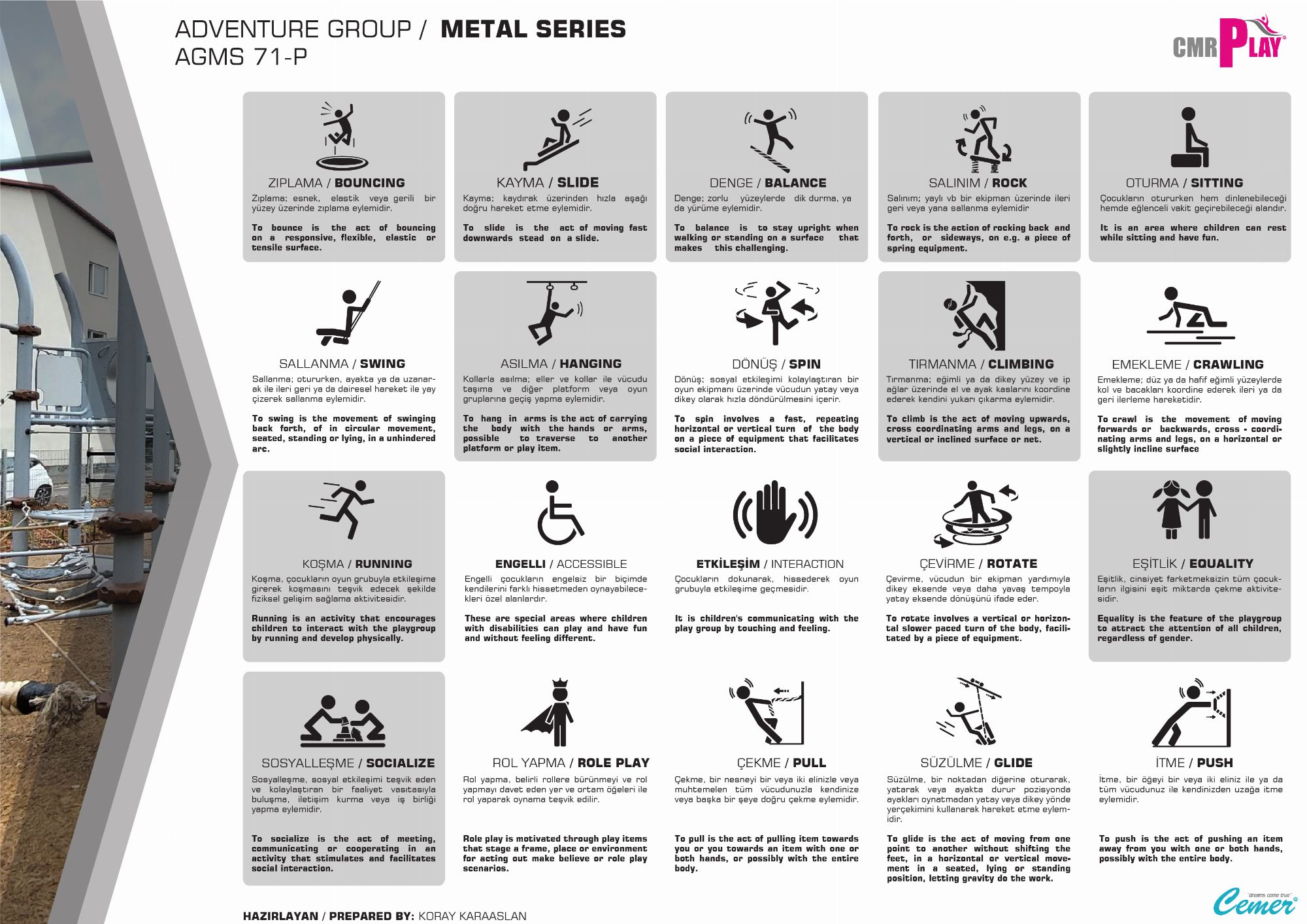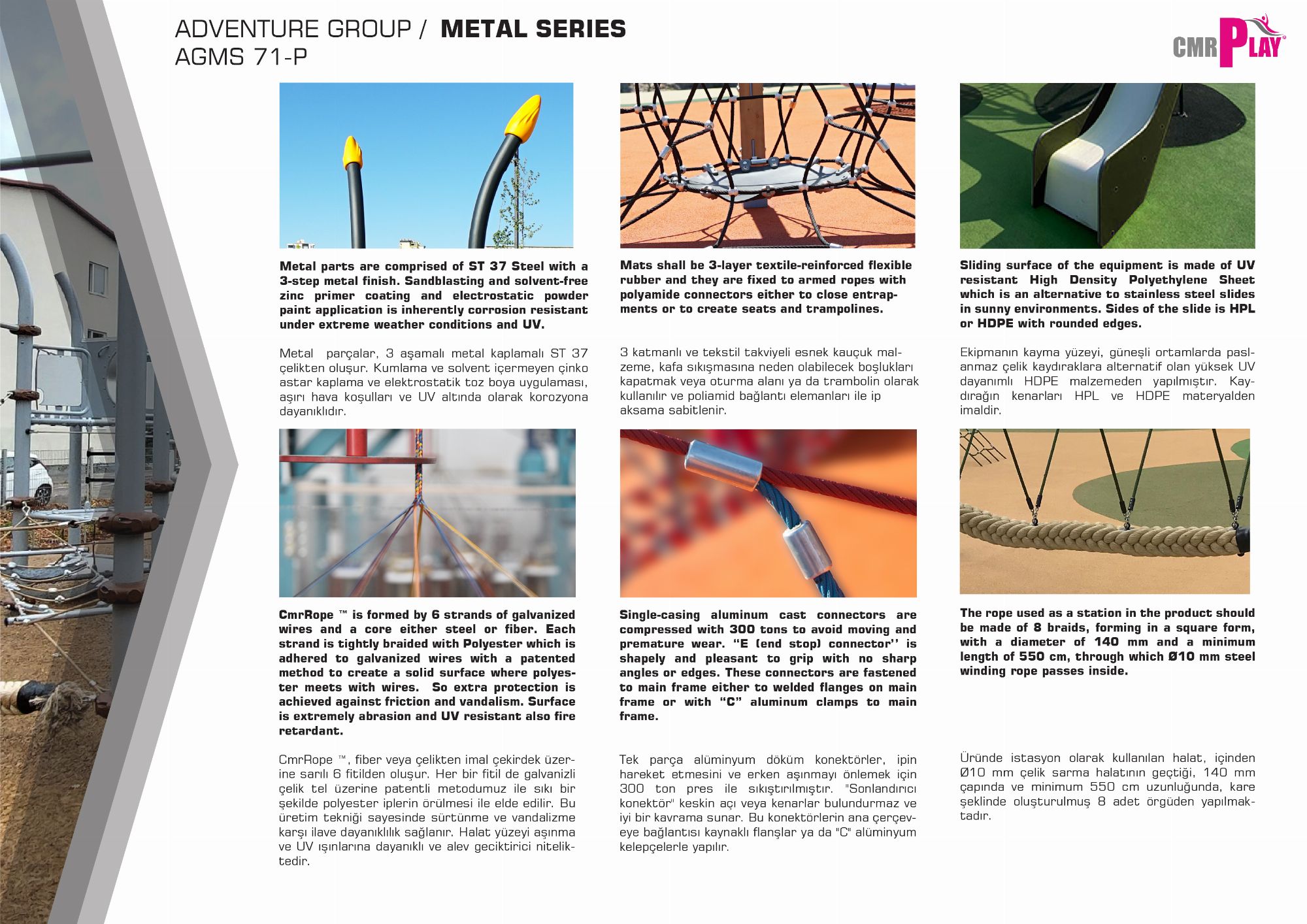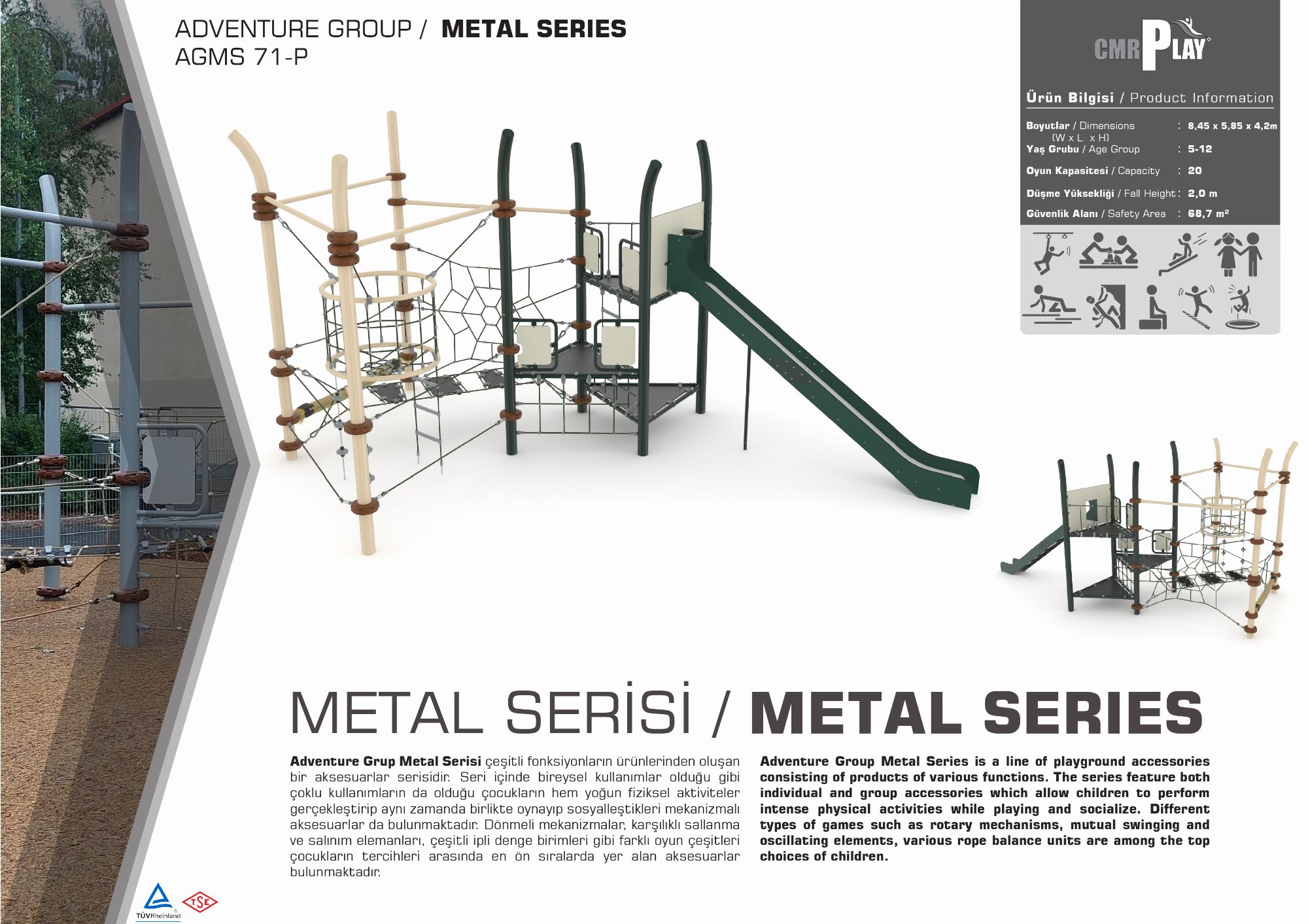 Adventure Grup Metal Serisi çeşitli fonksiyonların ürünlerinden oluşan bir aksesuarlar serisidir. Seri içinde bireysel kullanımlar olduğu gibi çoklu kullanımların da olduğu çocukların hem yoğun fiziksel aktiviteler gerçekleştirip aynı zamanda birlikte oynayıp sosyalleştikleri mekanizmalı aksesuarlar da bulunmaktadır. Dönmeli mekanizmalar, karşılıklı sallanma ve salınım elemanları, çeşitli ipli denge birimleri gibi farklı oyun çeşitler çocukların tercihleri arasında en ön sıralarda yer alan aksesuarlar bulunmaktadır.