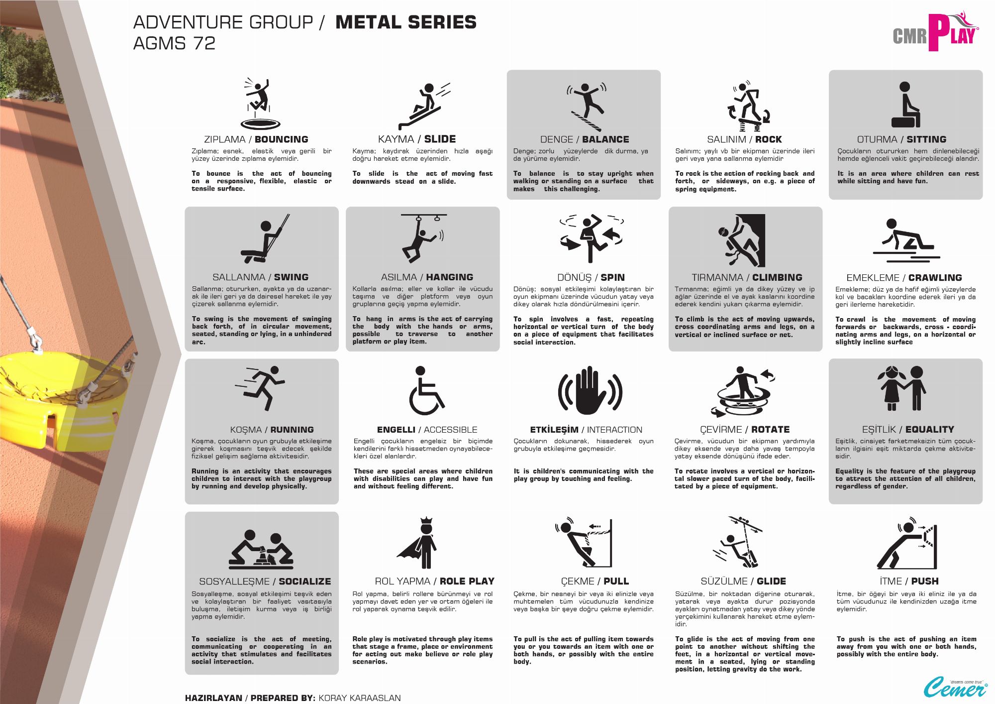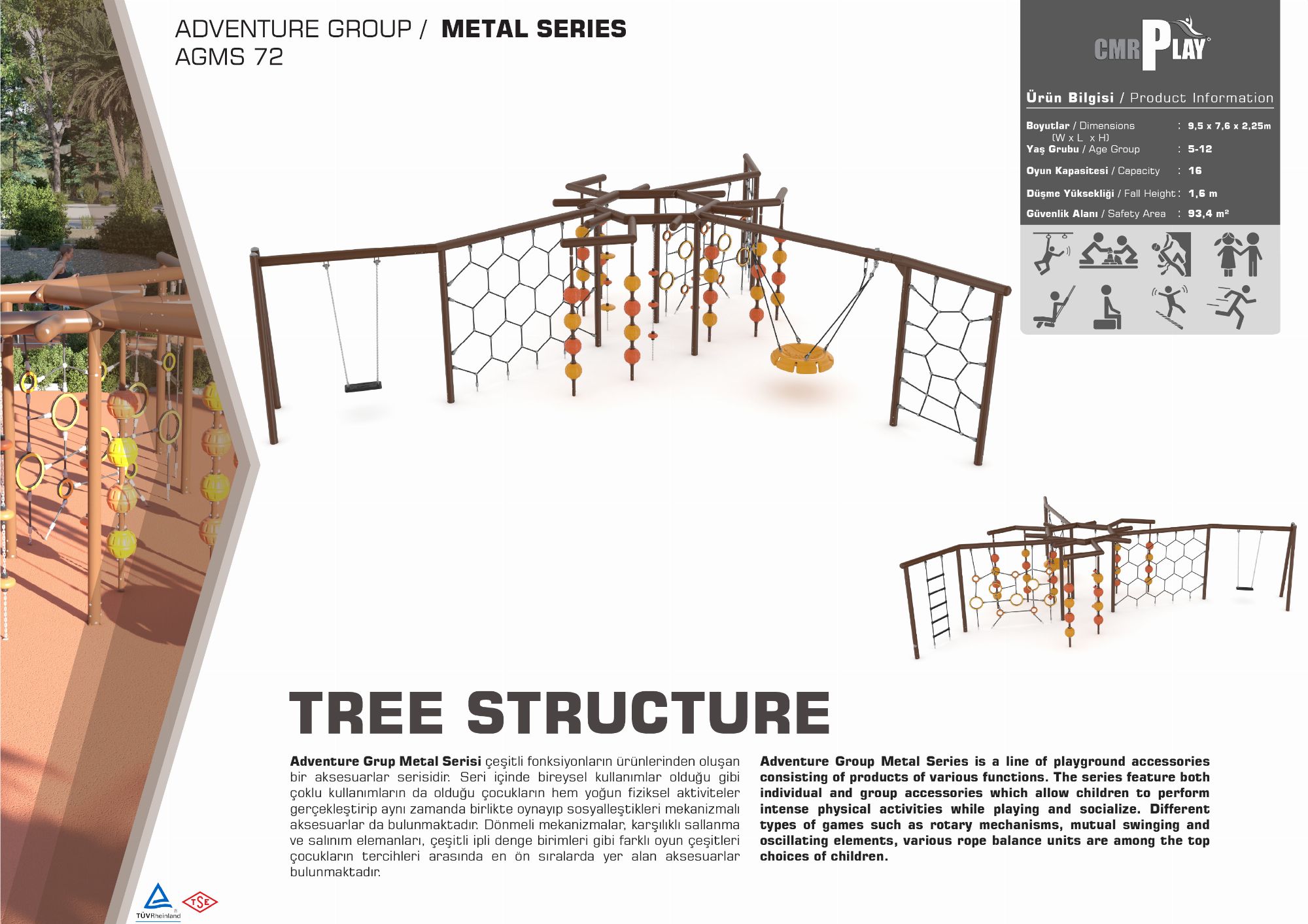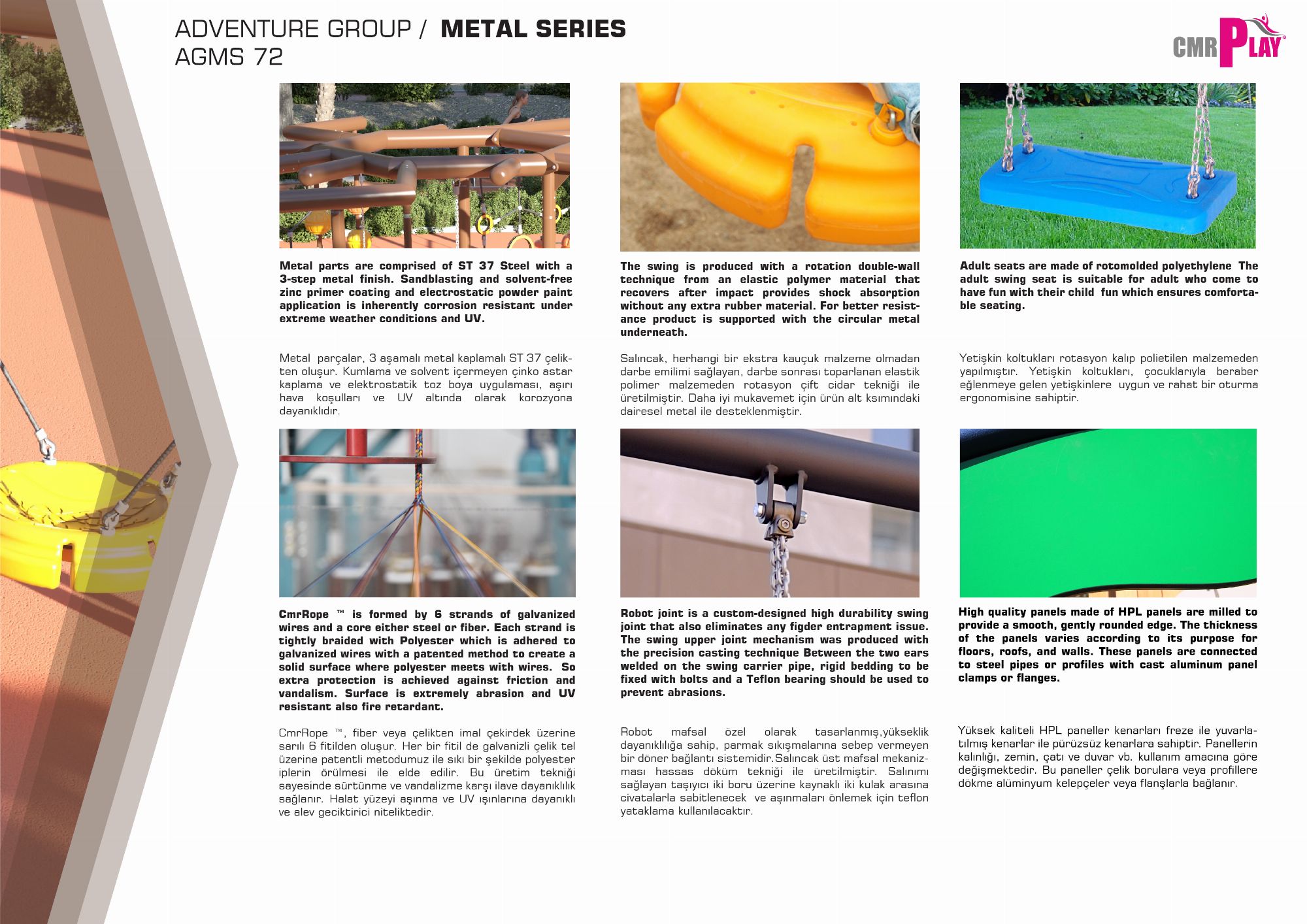 Adventure Grup Metal Serisi çeşitli fonksiyonların ürünlerinden oluşan bir aksesuarlar serisidir. Seri içinde bireysel kullanımlar olduğu gibi çoklu kullanımların da olduğu çocukların hem yoğun fiziksel aktiviteler gerçekleştirip aynı zamanda birlikte oynayıp sosyalleştikleri mekanizmalı aksesuarlar da bulunmaktadır. Dönmeli mekanizmalar, karşılıklı sallanma ve salınım elemanları, çeşitli ipli denge birimleri gibi farklı oyun çeşitleri çocukların tercihleri arasında en ön sıralarda yer alan aksesuarlar bulunmaktadır.