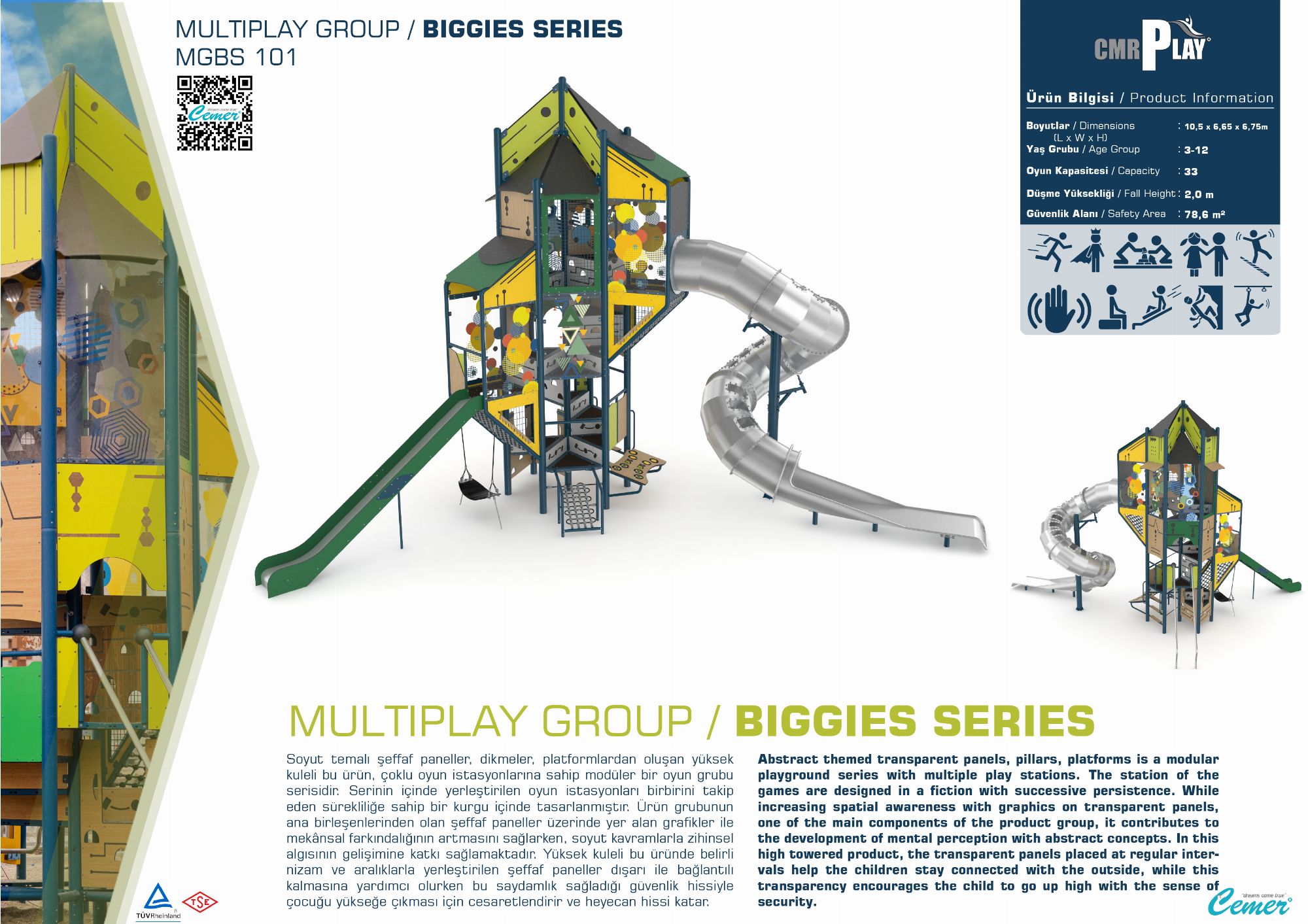 Biggies Serisi, yüksek kuleli bir oyun grubudur. Bu modüler grup, soyut temalı şeffaf paneller, dikmeler ve platformlardan oluşur. İçindeki çoklu oyun istasyonları, birbirini takip eden sürekliliğe sahip bir kurgu içinde tasarlanmıştır. Şeffaf paneller, serinin en dikkat çekici unsurlarındandır. Bu paneller, üzerindeki grafiklerle çocukların mekânsal farkındalığını artırır. Ayrıca, soyut kavramlarla zihinsel algılarının gelişimine de destek olur. Yüksek kule yapısı ve aralıklı şeffaf paneller, dış dünya ile bağlantıyı korur. Bu, çocuklara güvenlik hissi verir. Böylece çocuklar yükseğe çıkmaya cesaret eder ve heyecan dolu bir oyun deneyimi yaşarlar.