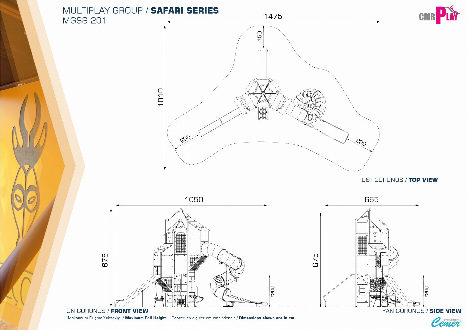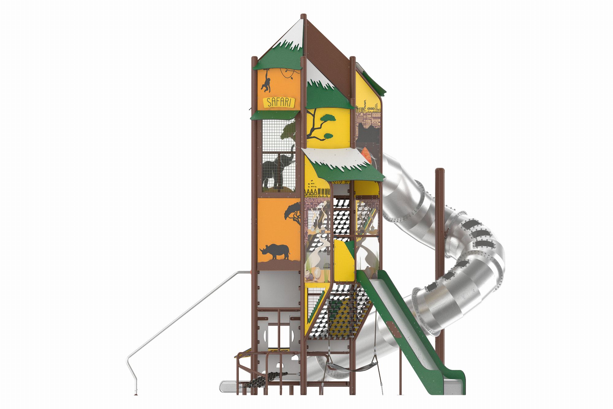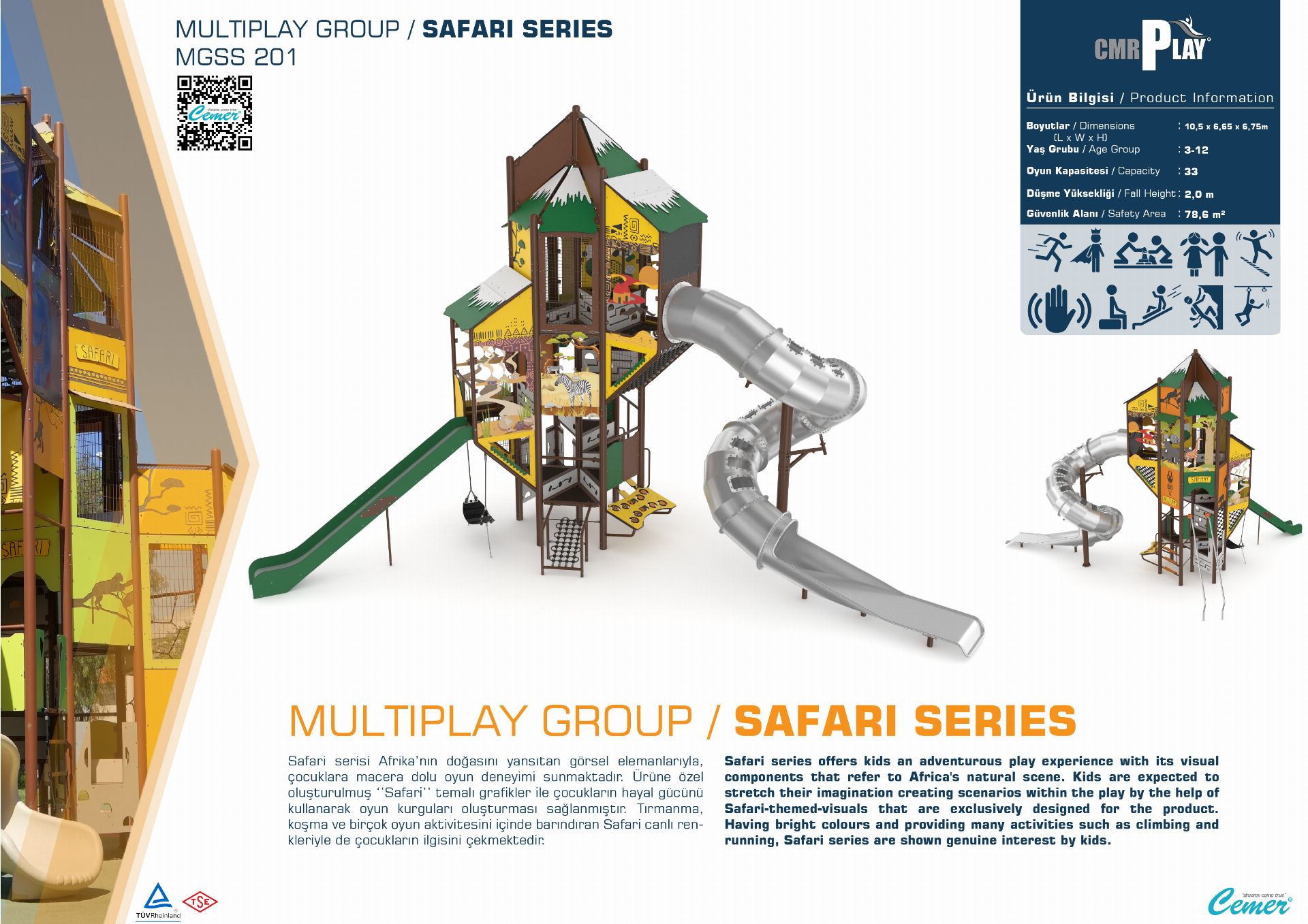 SAFARİ SERİSİ MGSS 201, safari temasına dayalı tasarımıyla çocukların hayal gücünü harekete geçiren ve fiziksel gelişimlerine katkı sağlayan çok fonksiyonlu bir oyun parkıdır. Kaydıraklar, tırmanma alanları ve panel oyun elemanları ile zenginleştirilmiştir. Estetik ve dayanıklı yapısı ile her tür açık alan için uygundur.Kaydırak iki adet paslanmaz çelik malzemeden imal edilmiştir.