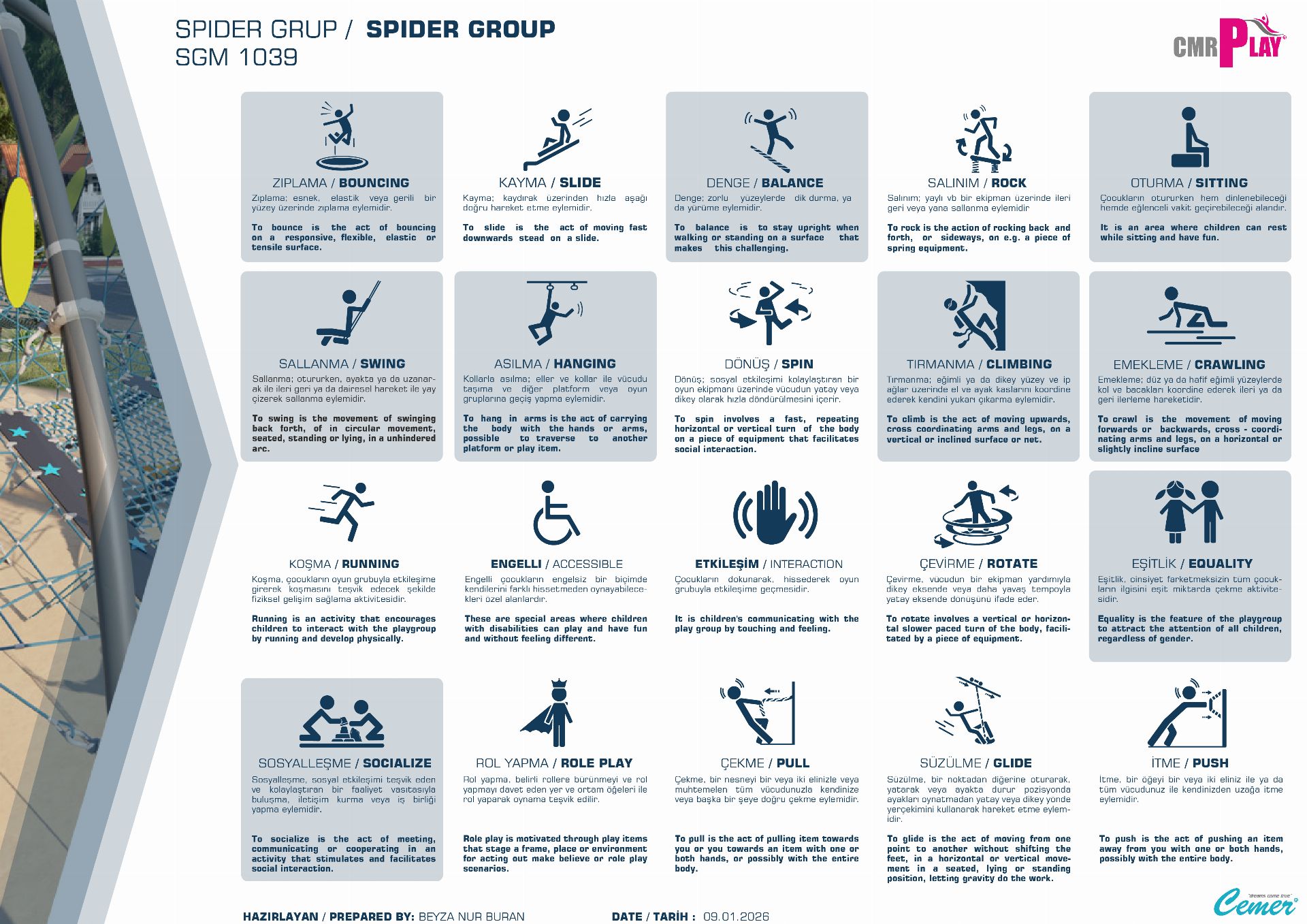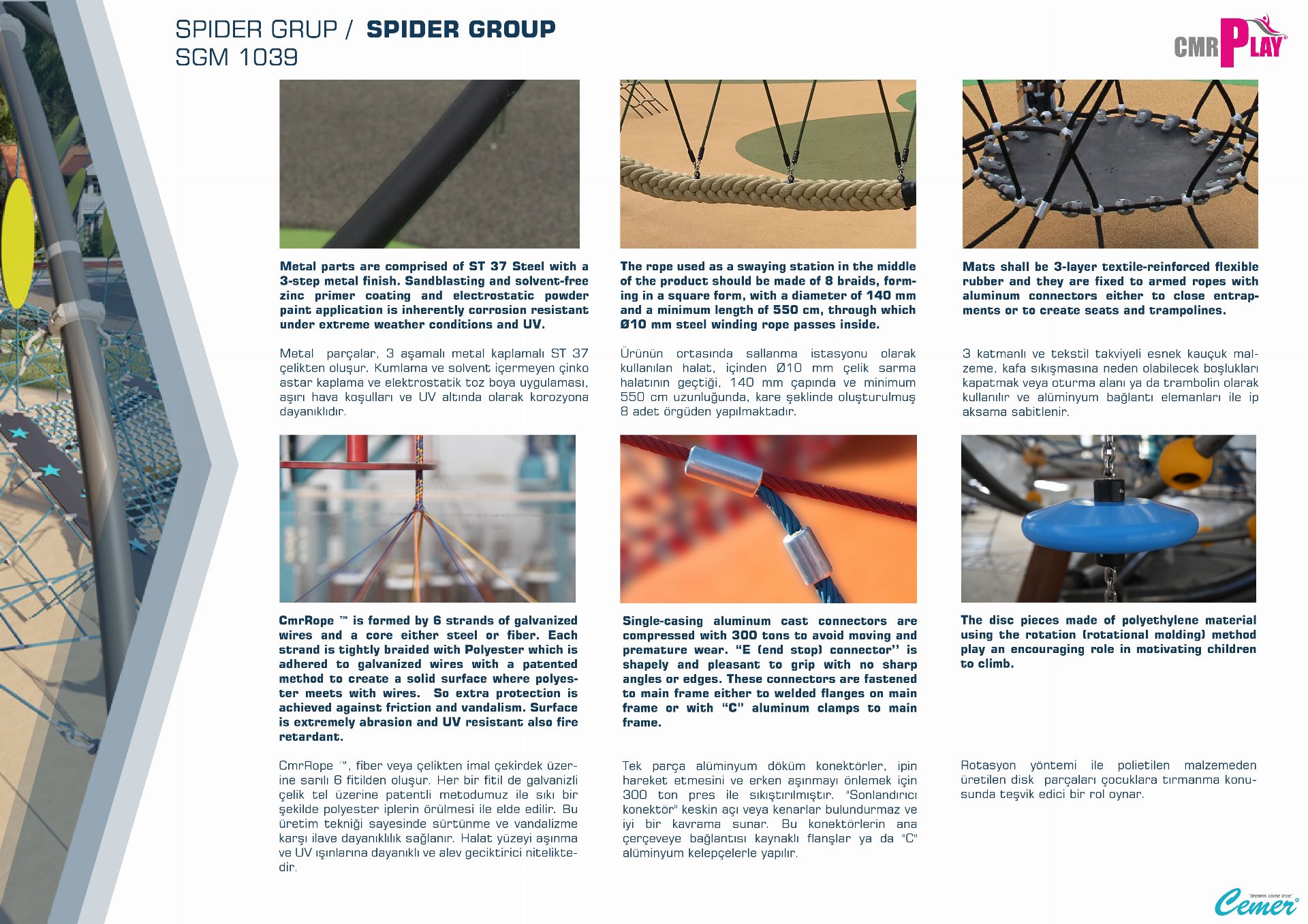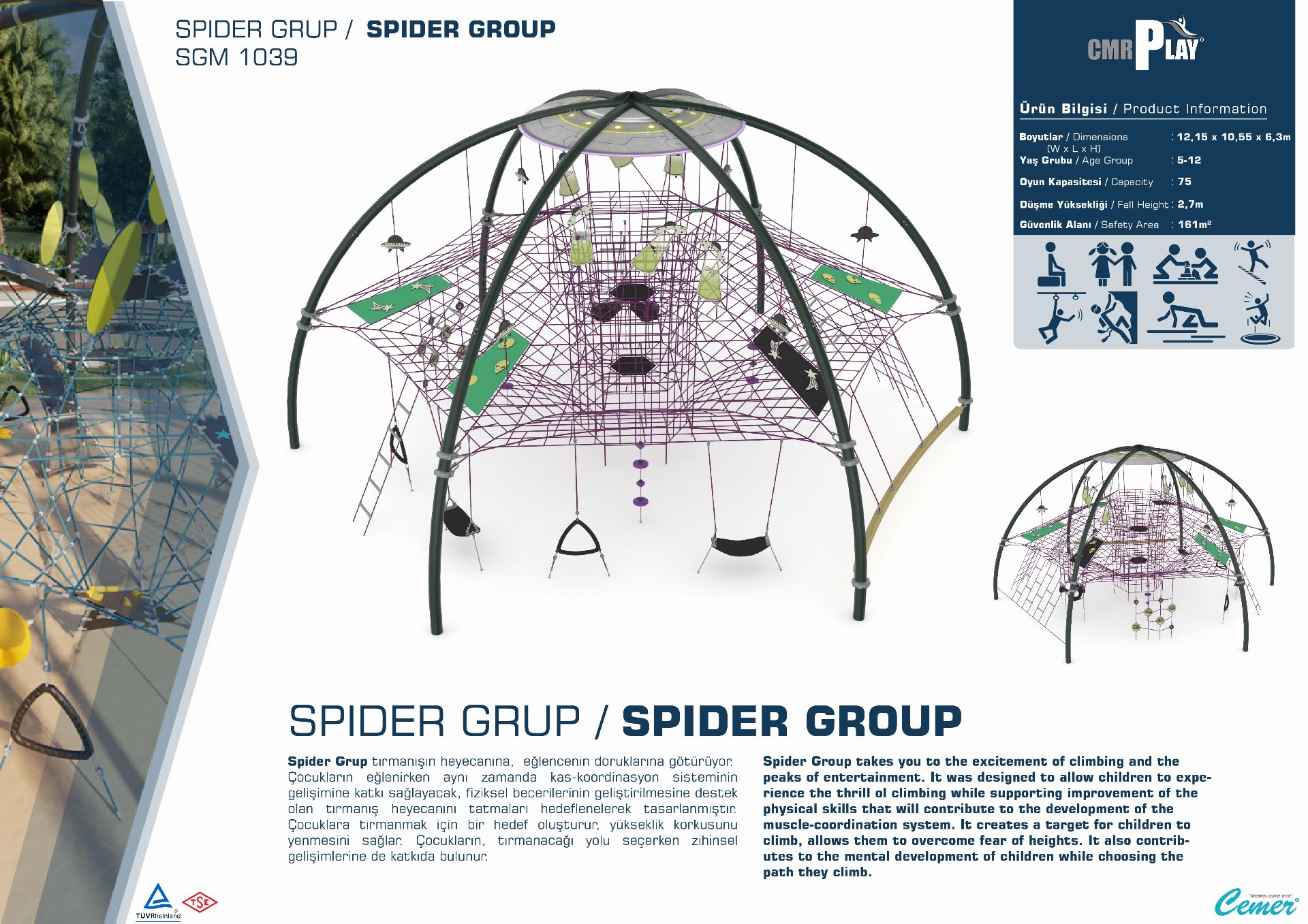 Cemer Kent Ekipmanları EN standartlarına uygun zemin uygulamaları , darbe emici özelliklere sahip olup güvenliği sağlar.