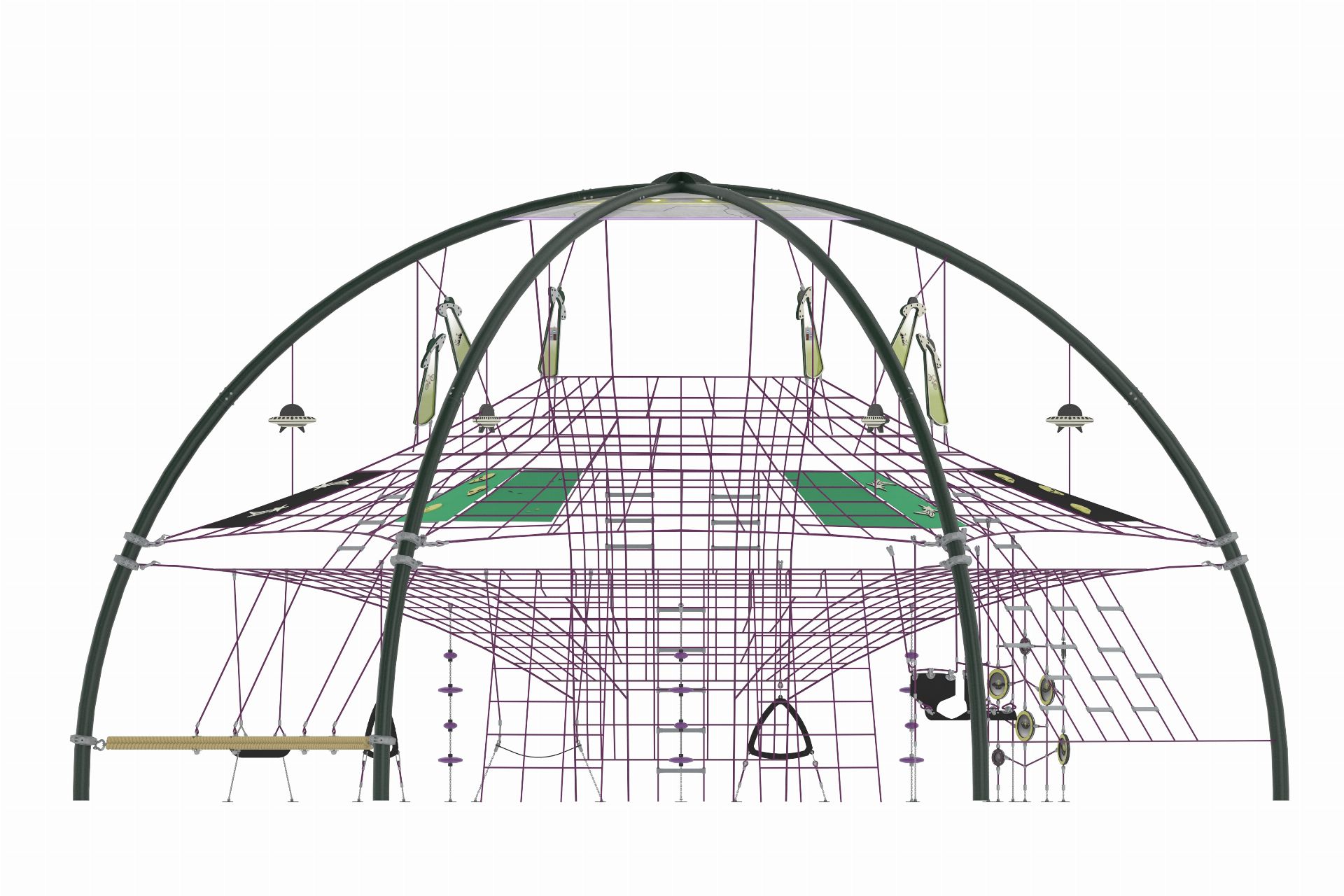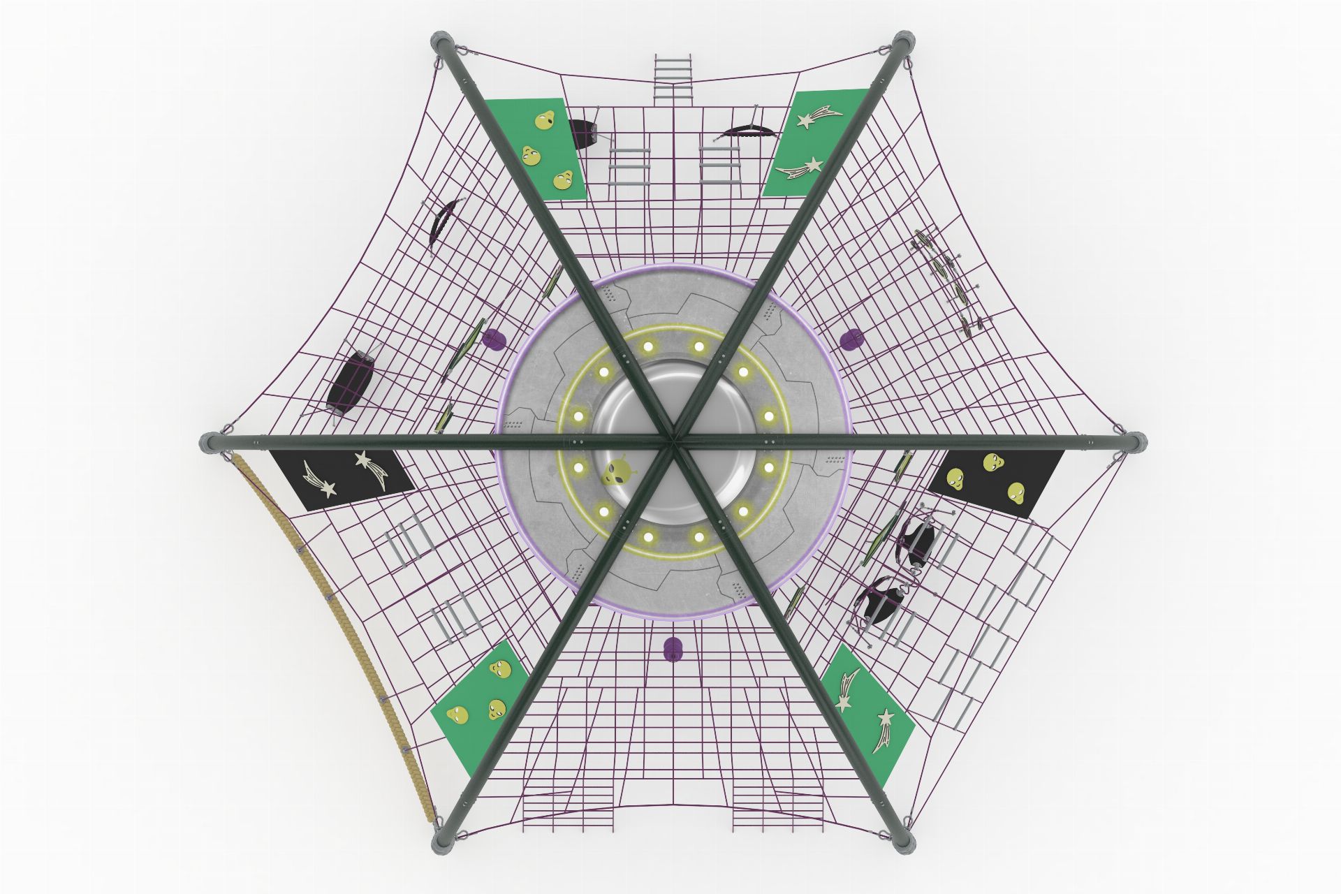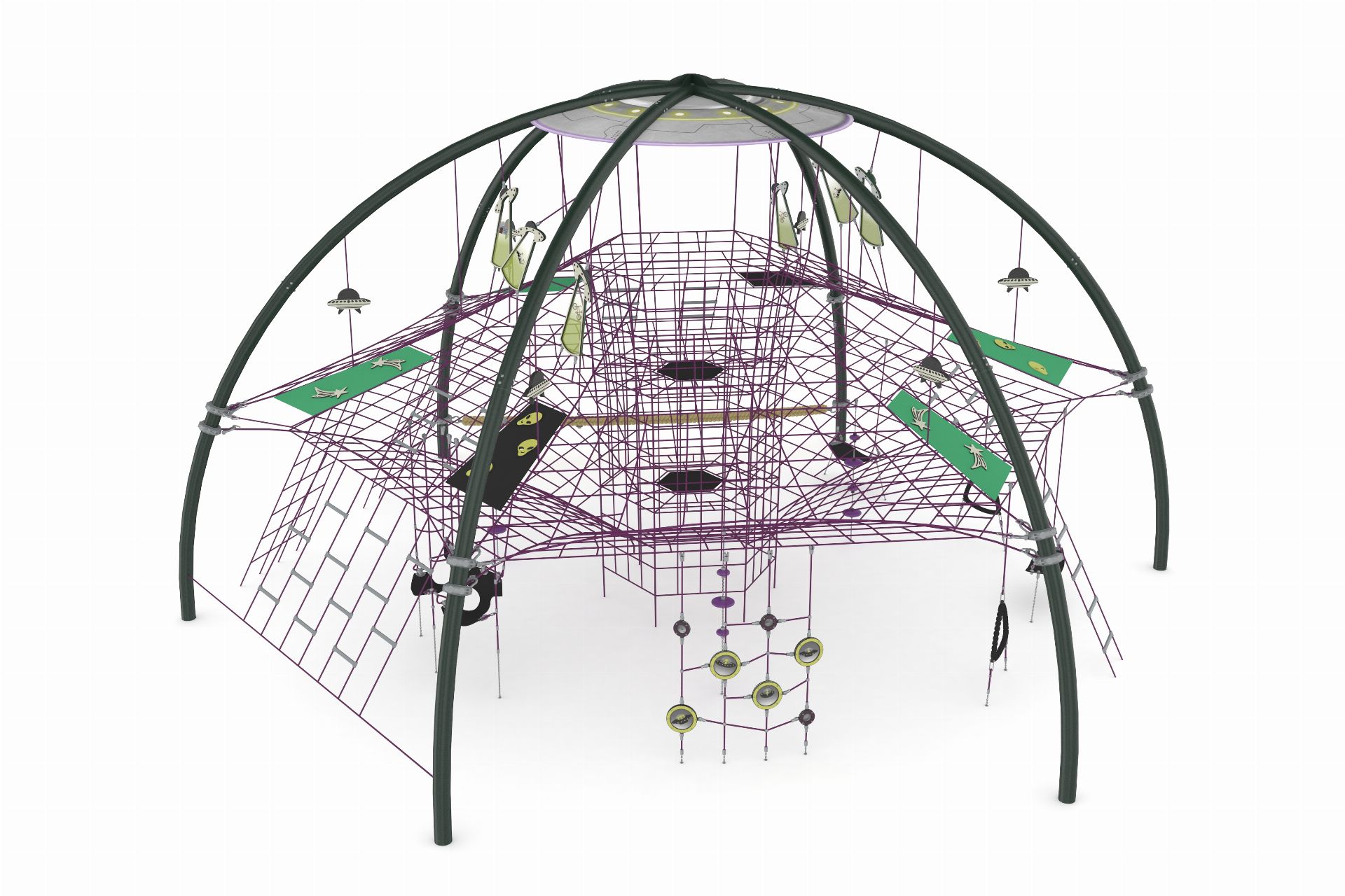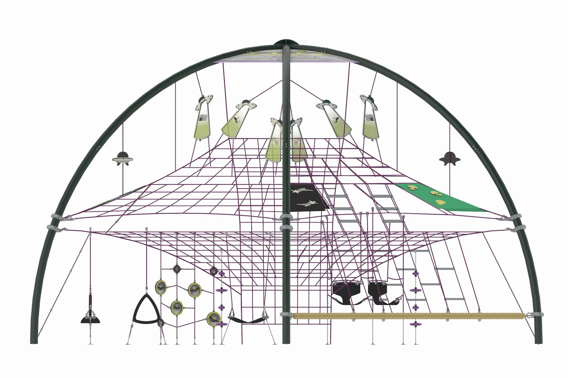 Astro Dome, çocukları uzayın keşif dünyasına taşıyan yenilikçi ve çok fonksiyonlu bir oyun alanıdır. Farklı tırmanma elemanları, geçitler, hamaklar ve dinlenme alanları ile zenginleştirilmiş yapısı sayesinde eğlenceyi fiziksel gelişimle bir araya getirir. Metal ve ip konstrüksiyonun sağlam birleşimi, güvenli ve uzun ömürlü bir kullanım sunarken, tematik polikarbon detaylar ürünün görsel etkisini güçlendirir.