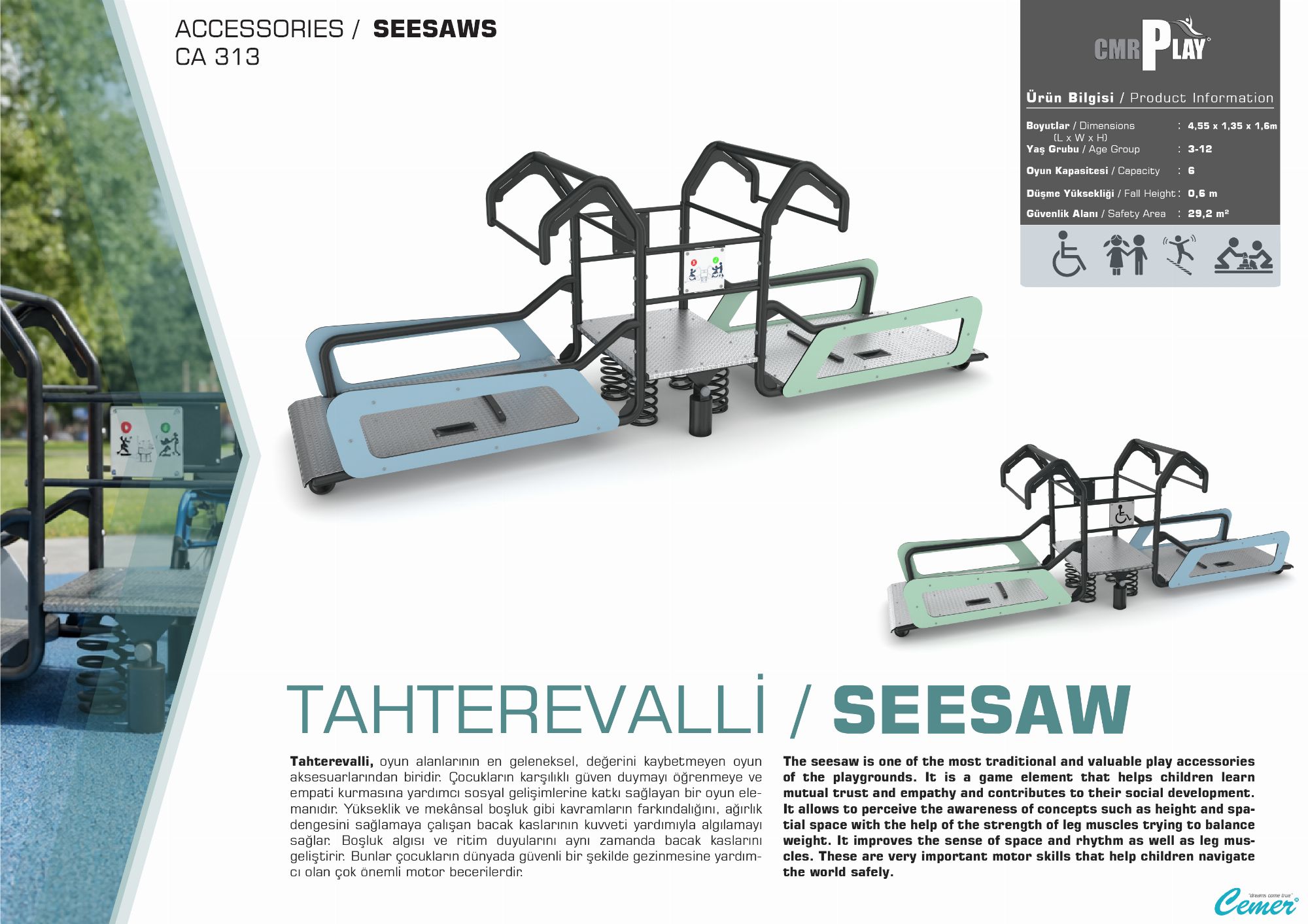 Tahterevalli, oyun alanlarının en geleneksel, değerini kaybetmeyen oyun aksesuarlarından biridir. Çocukların karşılıklı güven duymayı öğrenmeye ve empati kurmasına yardımcı sosyal gelişimlerine katkı sağlayan bir oyun elemanıdır. Yükseklik ve mekânsal boşluk gibi kavramların farkındalığını, ağırlık dengesini sağlamaya çalışan bacak kaslarının kuvveti yardımıyla algılamayı sağlar. Boşluk algısı ve ritim duyularını aynı zamanda bacak kaslarını geliştirir. Bunlar çocukların dünyada güvenli bir şekilde gezinmesine yardımcı olan çok önemli motor becerilerdir.