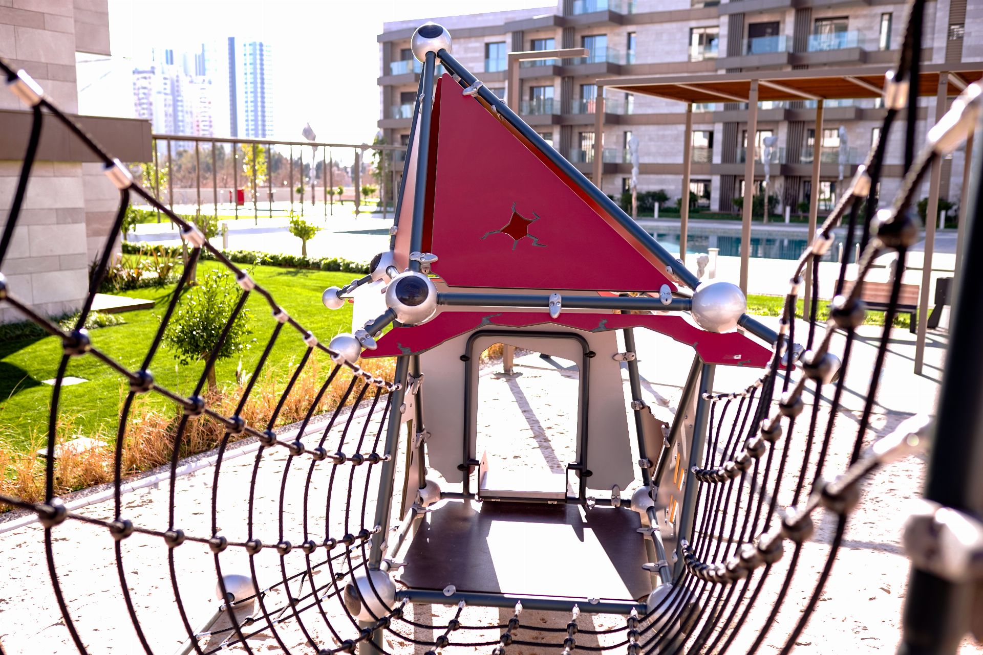 Çelik boru ve profiller, paslanmaya karşı dayanıklıdır ve yapıdaki sağlamlığı artırır.Halatlar altı telli galvanizli çelik tel ve polyester malzeme ile üretilmiştir. Bu özel işlem, telin üzerinde sağlam bir yüzey oluşmasını sağlar ve aşınmayı engeller. UV ışınlarına dayanıklı ve yangına karşı alev geciktirici özelliğe sahiptir.